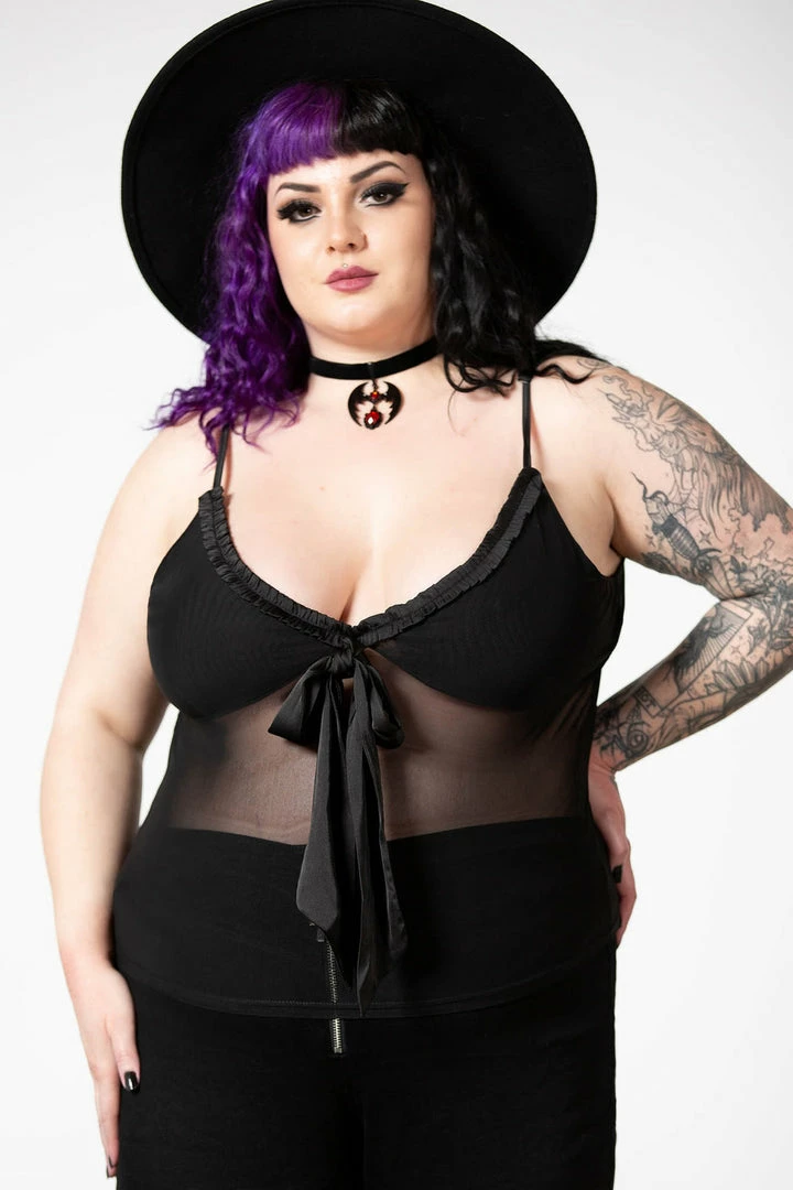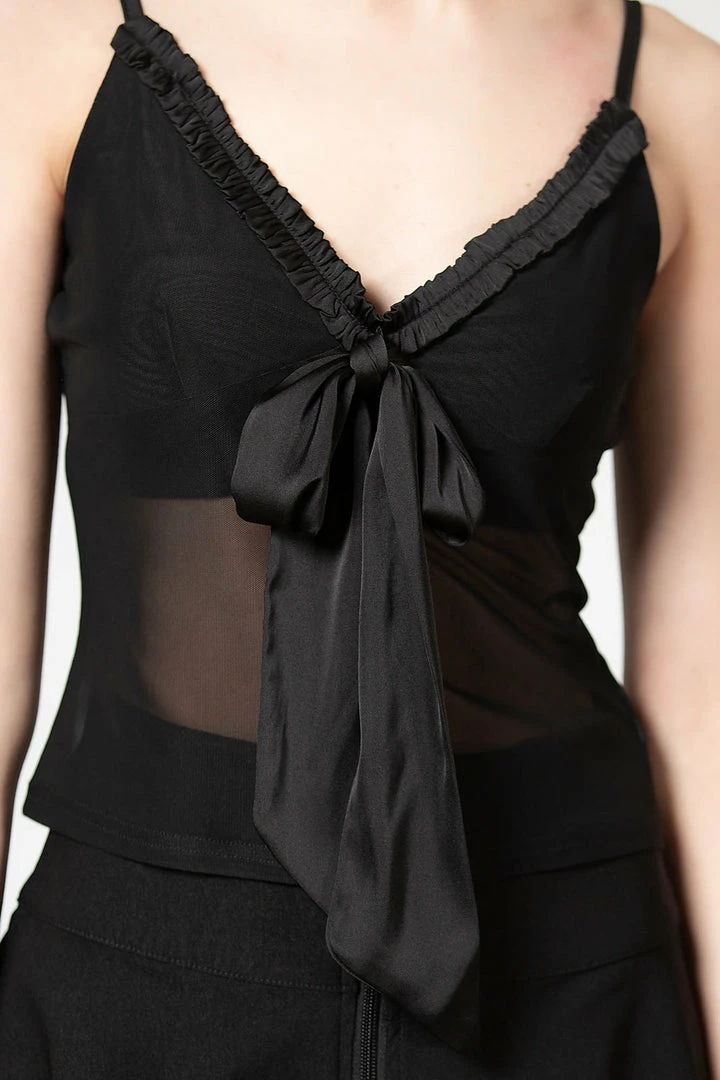 This beautiful and seductive black top is made from a soft stretchy mesh fabric that is fitted to flatter your figure. This gorgeous sleeveless top features a low V neck with elegant ruffles and satin ribbon detail as well as non mesh unpadded cups! Looks amazing on!