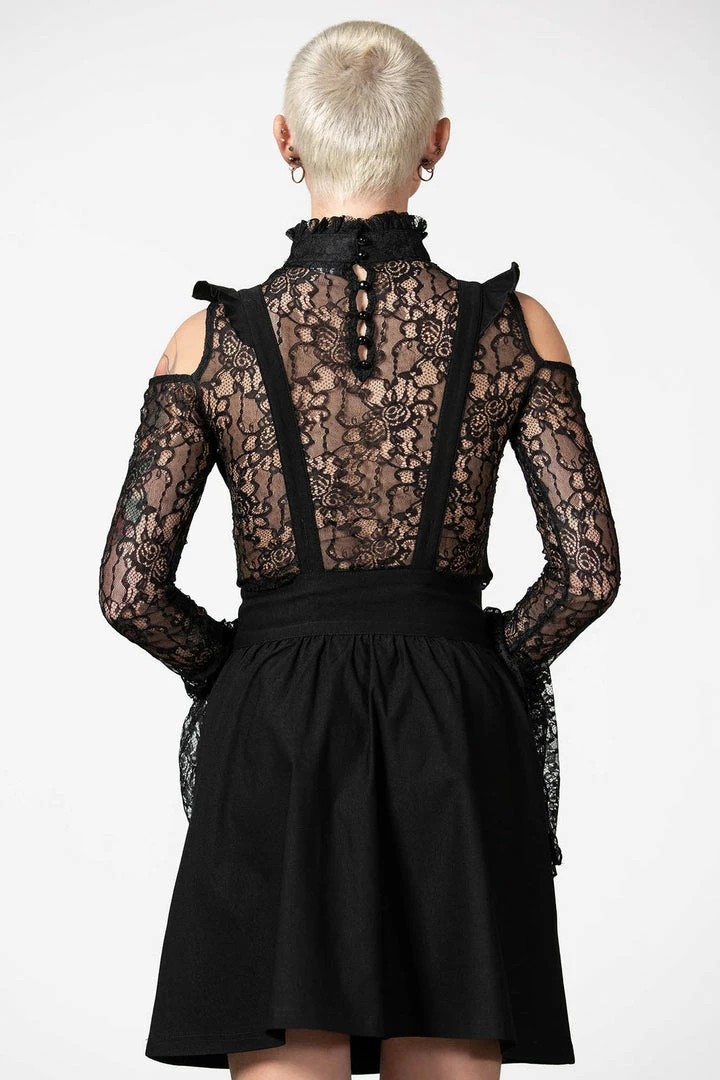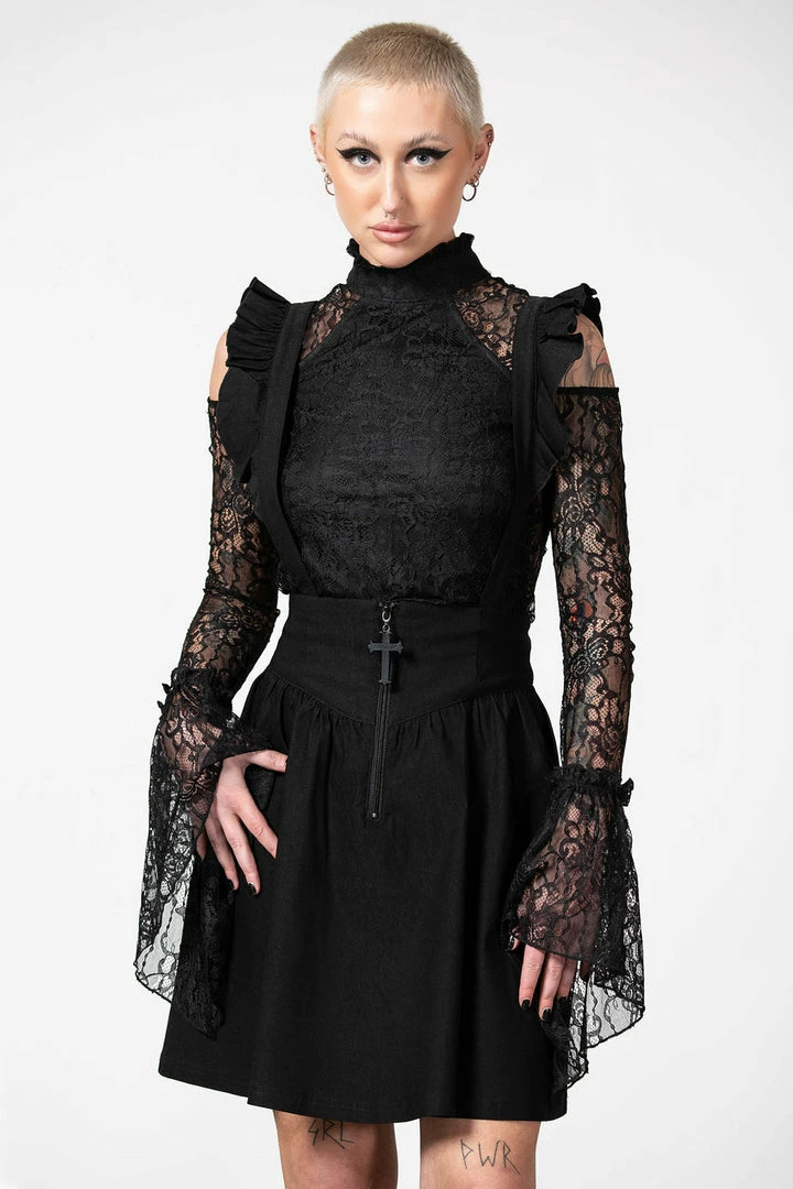 Gorgeous black skirt from Killstar with flowing skater style and ruffled suspenders! This must-have high waisted skirt is made from a soft stretchy fabric for a comfortable yet flattering silhouette! This lovely skirt features a front zip with black metal cross and looks awesome on, dressed up or down!