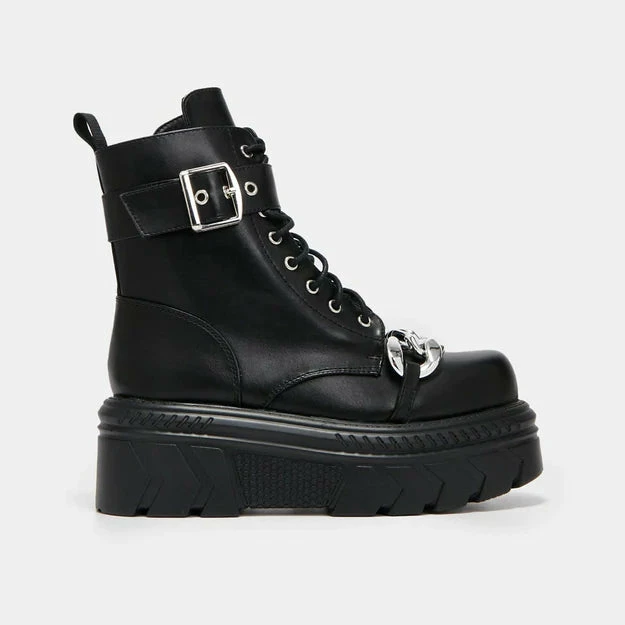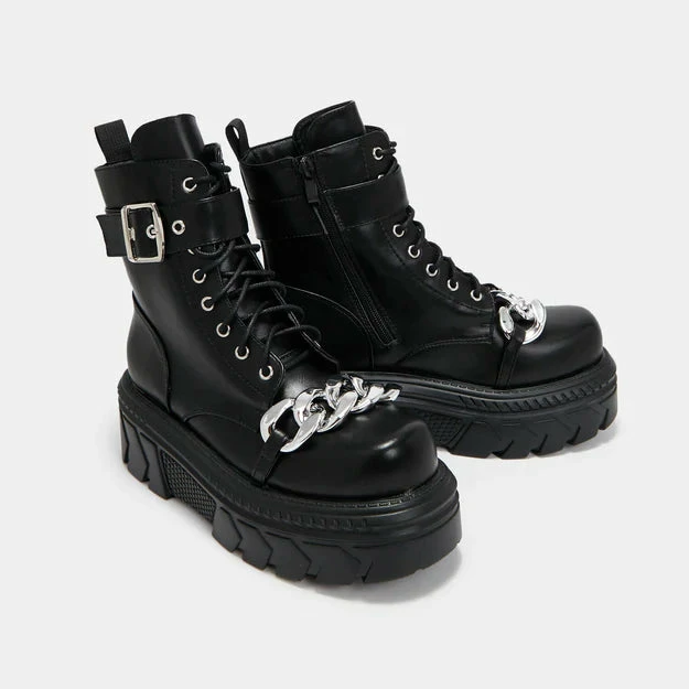 These awesome black boots from Koi feature a statement metal chain, lace ups and adjustable belt strap. Sitting on a chunky platform to elevate your look, these eye-catching vegan leather boots are super comfy to wear and look amazing on. Side zips for easy on and off!