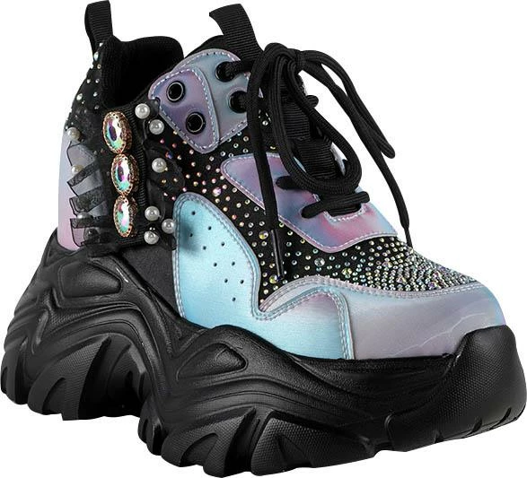 Stand out with the Watermelon-02 blingin’ platform sneakers from Anthony Wang! Black background and lace sneakers with iridescent sections all around. Rhinestones along the upper and a cute bedazzled bow on the outside. Signature Anthony Wang hidden wedge heel; 2 inch (5cm) platform and 4.5 inch (11.5cm) wedge heel. With a mixture of textures, gems and colours, these sneakers have so much personality!
