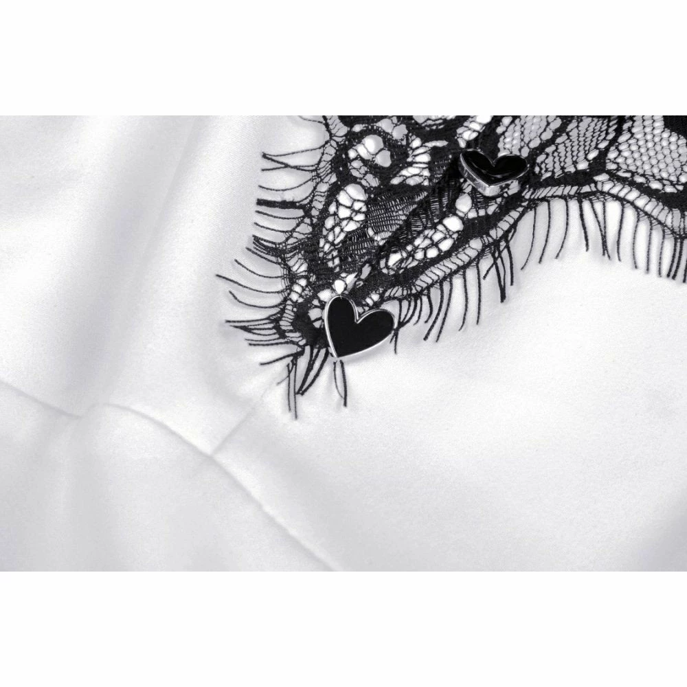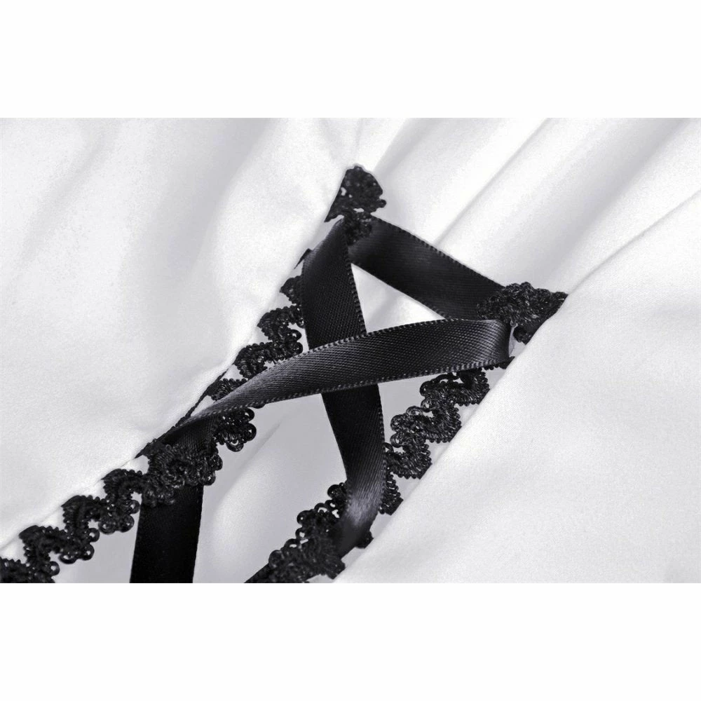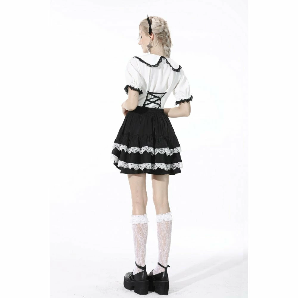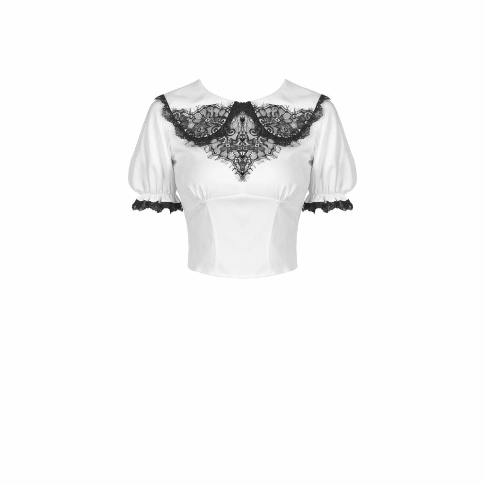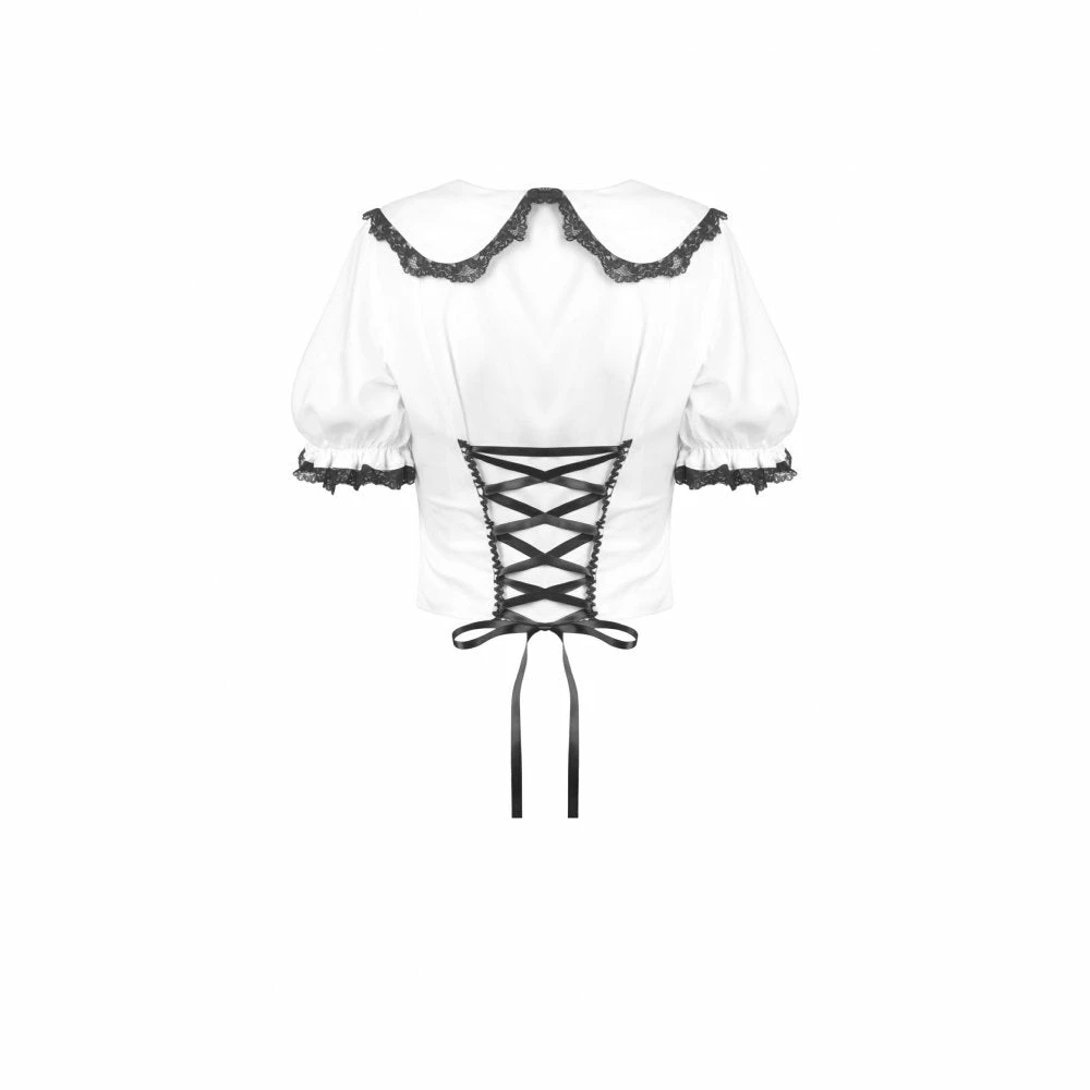 Beautiful cropped white blouse from Dark In Love with contrast black edging and lacing! This stunning white collared top features a short sleeves and black lace up detailing on the back!