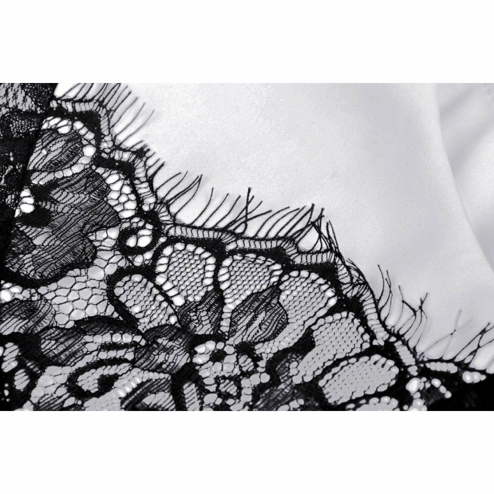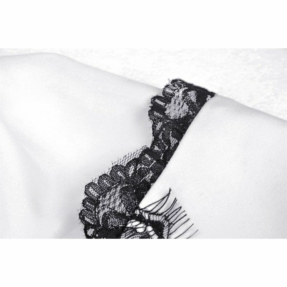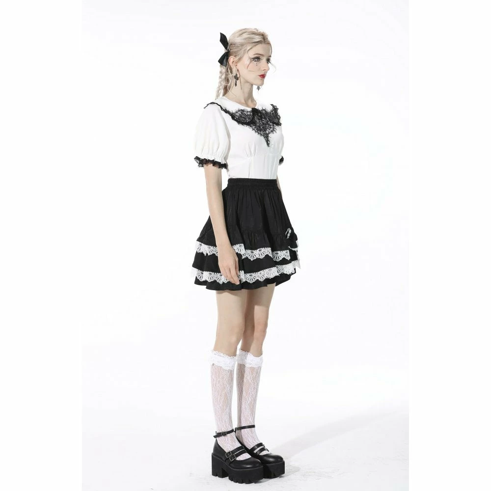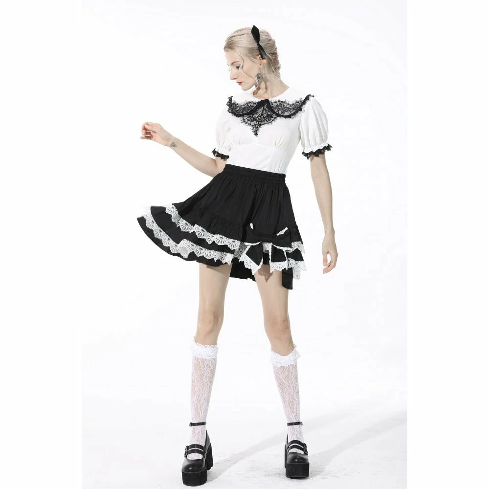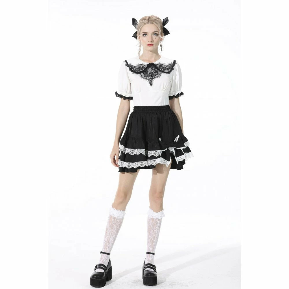 Beautiful cropped white blouse from Dark In Love with contrast black edging and lacing! This stunning white collared top features a short sleeves and black lace up detailing on the back!