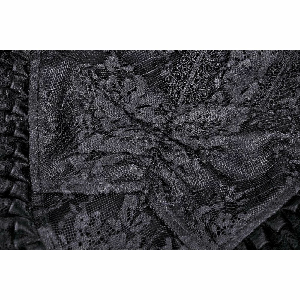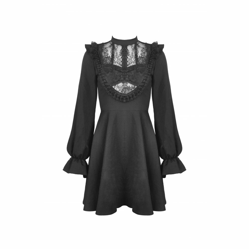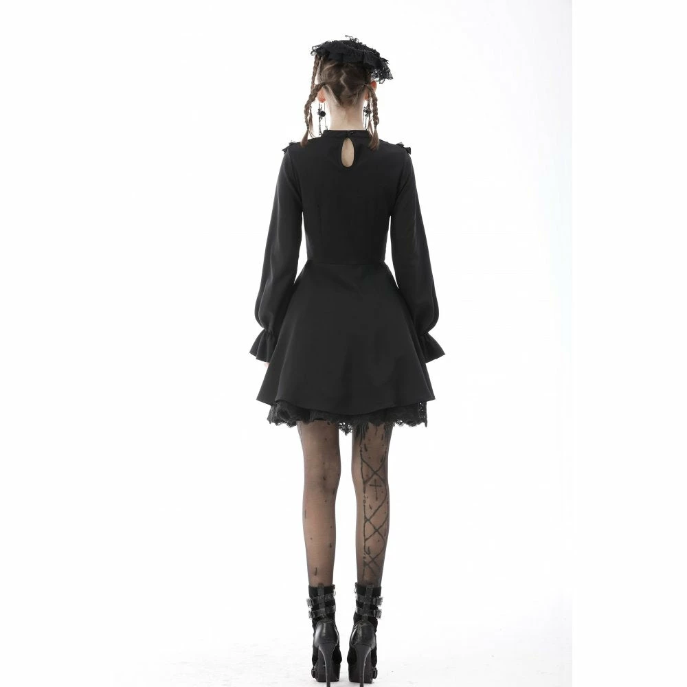 Beautiful and seductive black mini dress by Dark in Love in a soft slightly stretchy fabric with delicate lace detailing. This sexy mini dress features a super low neckline with built in bra and flirty lace paneling. Also featuring long sleeves, nipped in waist and flowing skirt, this dress stands out from the crowd.