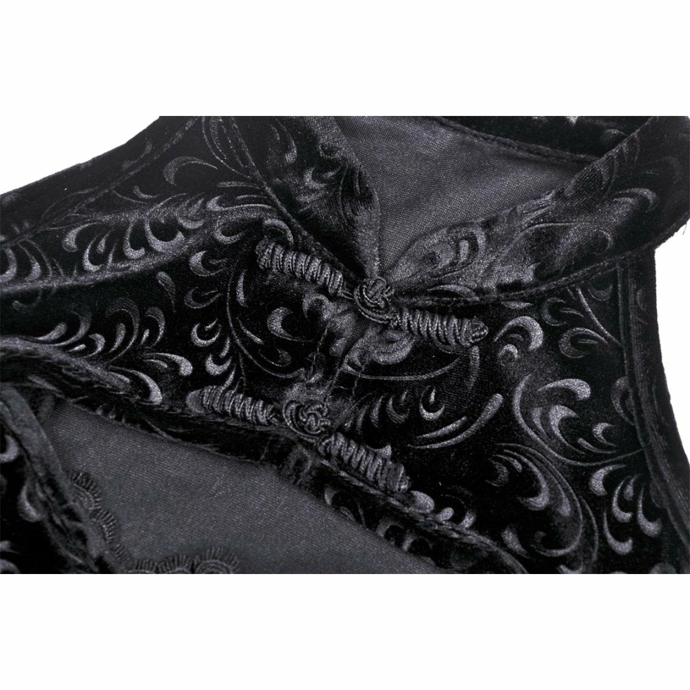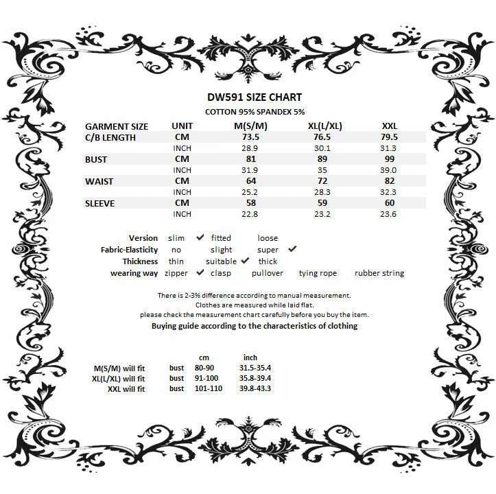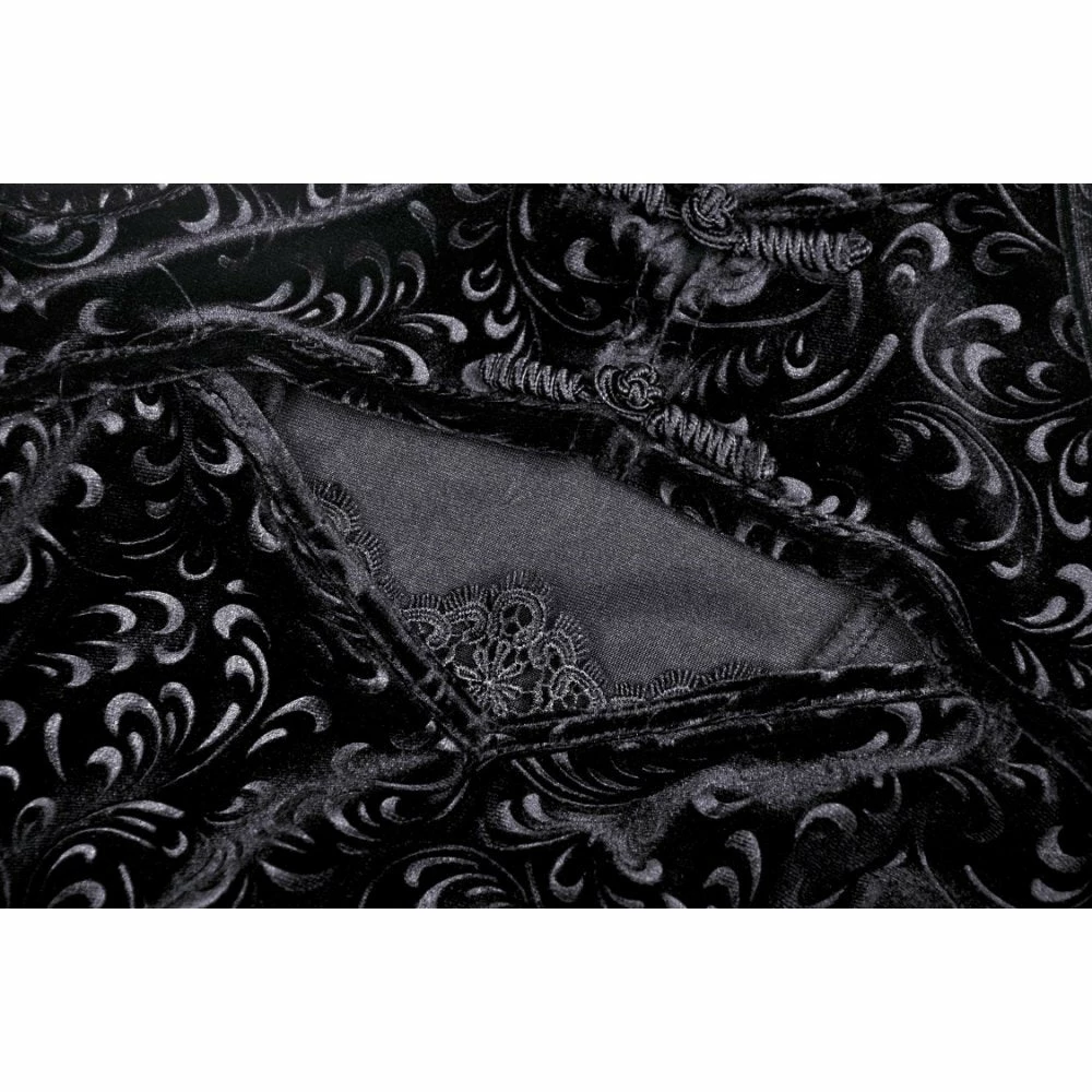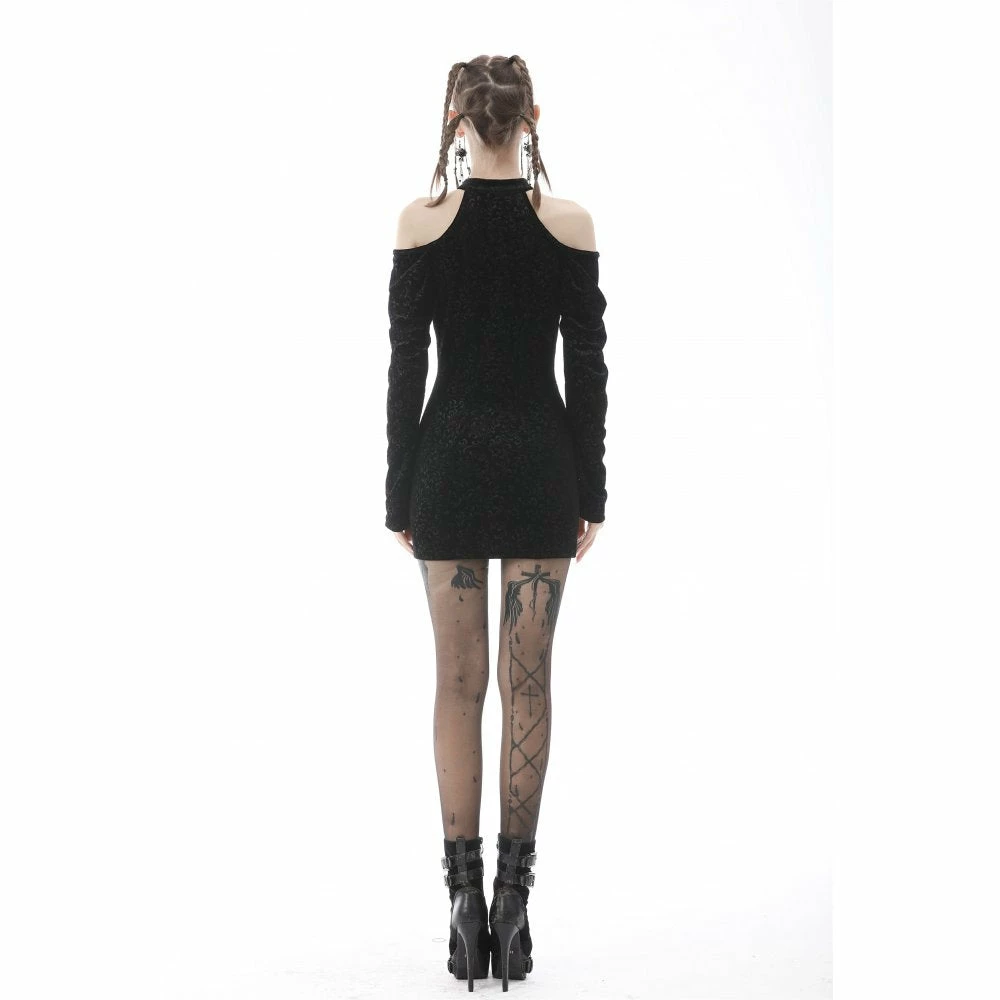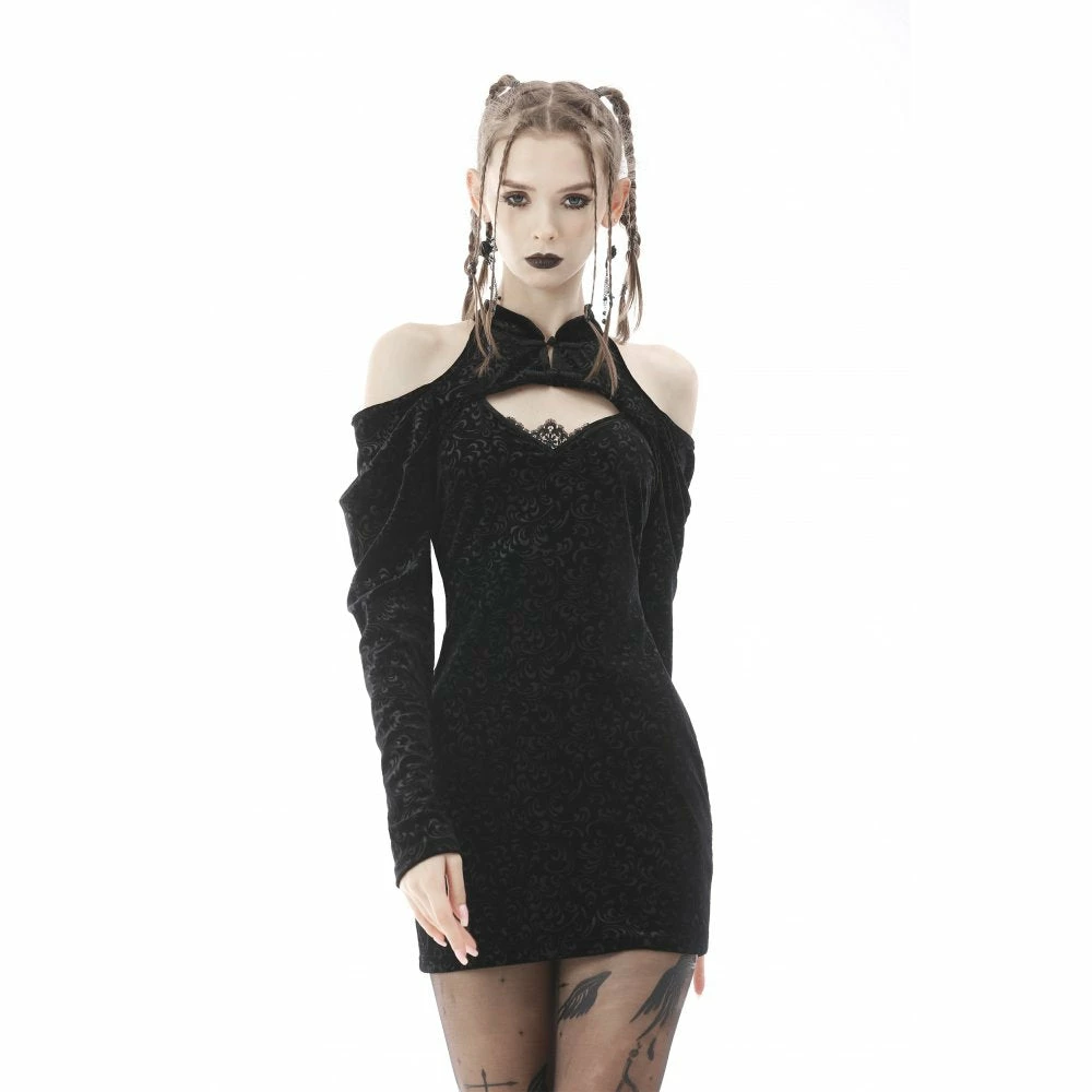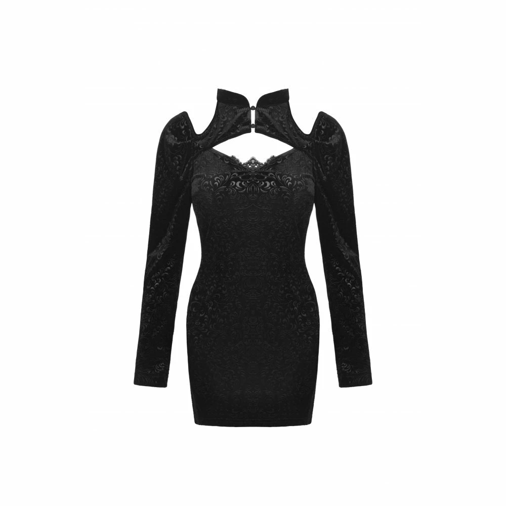 Stunning cold shoulder dress from Dark in Love featuring a mandarin collar fastening with frog buttons to the front and a lace trimmed cut-out to the décolletage. This gorgeous dress has a body-con design to it with long relaxed fit sleeve and fastens with a concealed zip to the side. All in a lovely soft embossed velvet, for the perfect fit please see Dark in Loves size guide in the images.