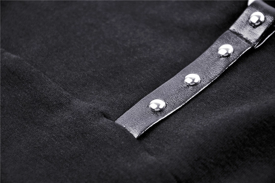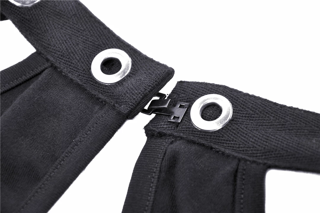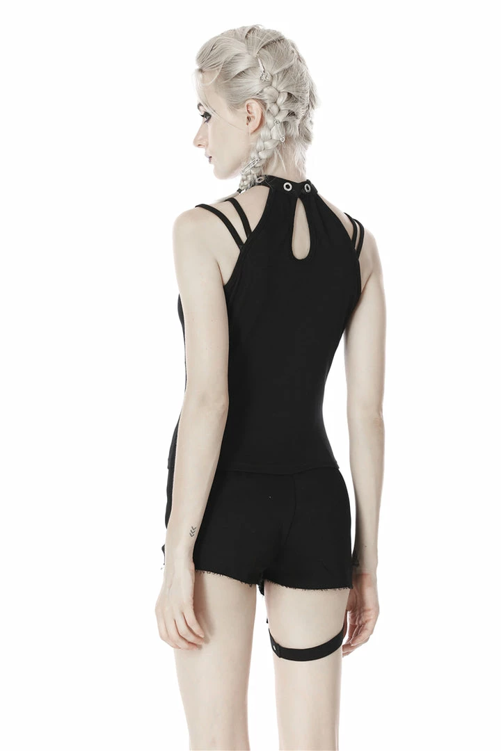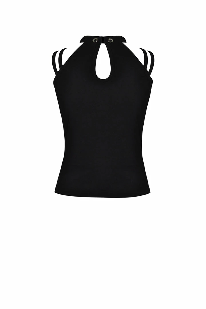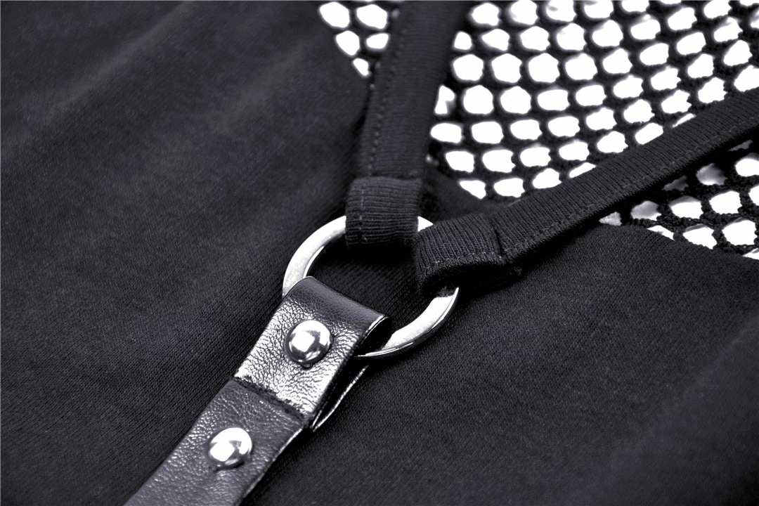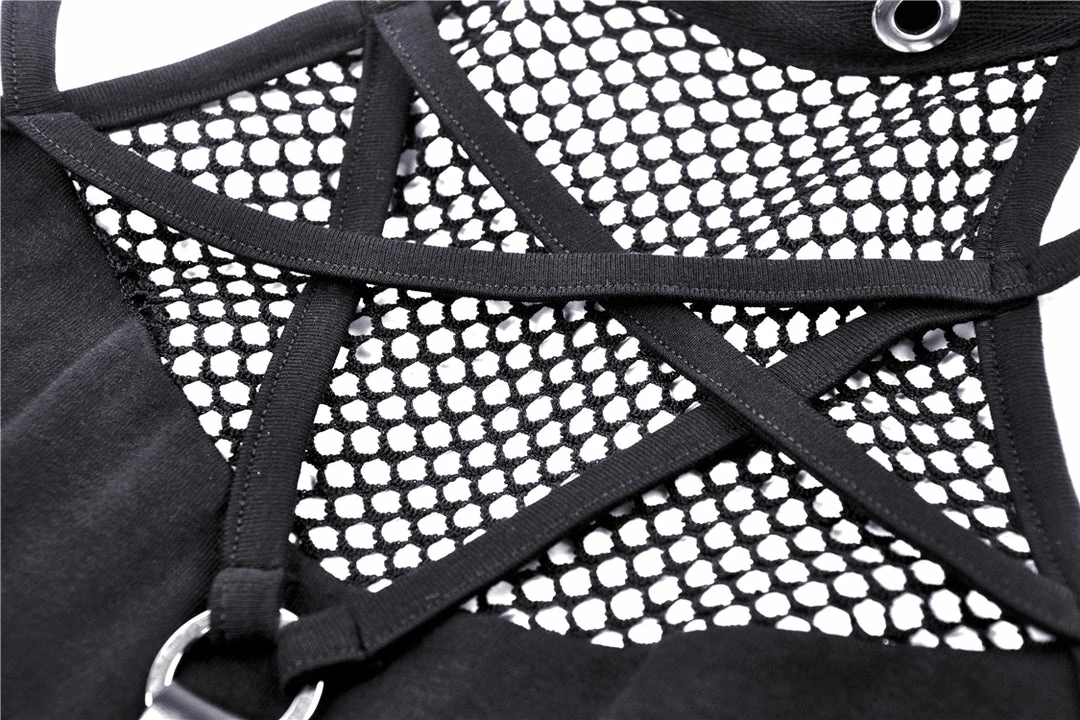 Beautiful hip length top from Dark In Love! This stunning top features an eyelet studded choker with fishnet panel, spaghetti straps in a pentagram design, hook and eye closure to the back of the choker and studded faux leather accent to the bust centre.