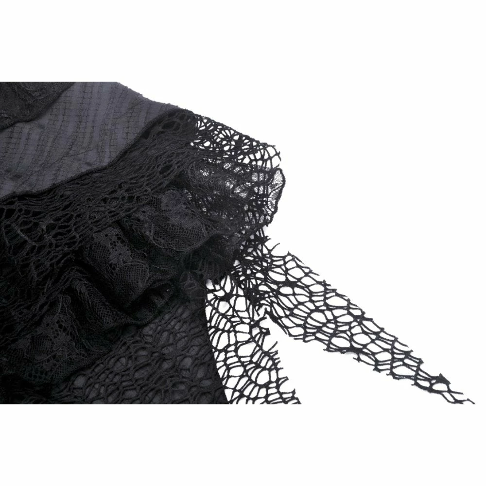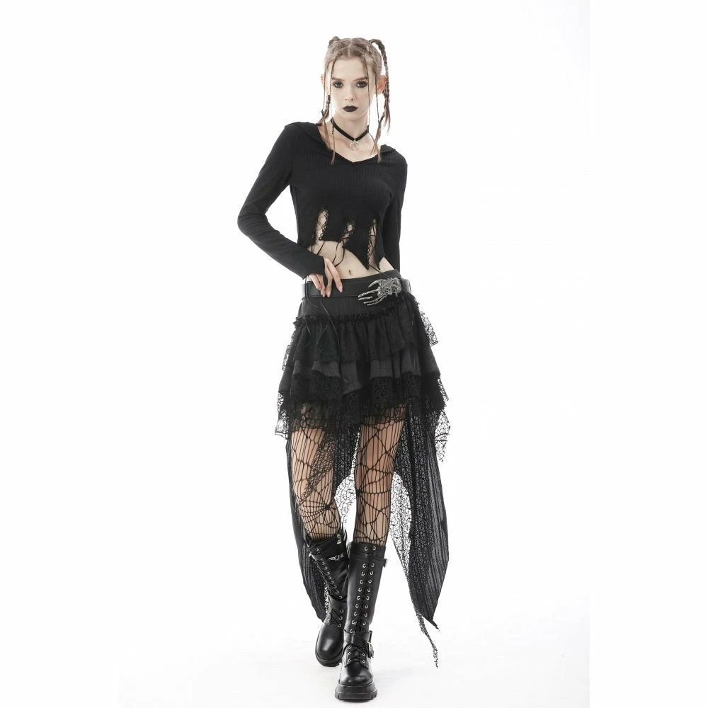 You’ll love this stunning black high low lace skirt from Dark in Love made from a soft fabric in a fitted flattering style! This dramatic skirt features a mini skirt with lace ruffles and long panels and has an elasticated waistband. Looks perfect worn on a night out with heels or boots!