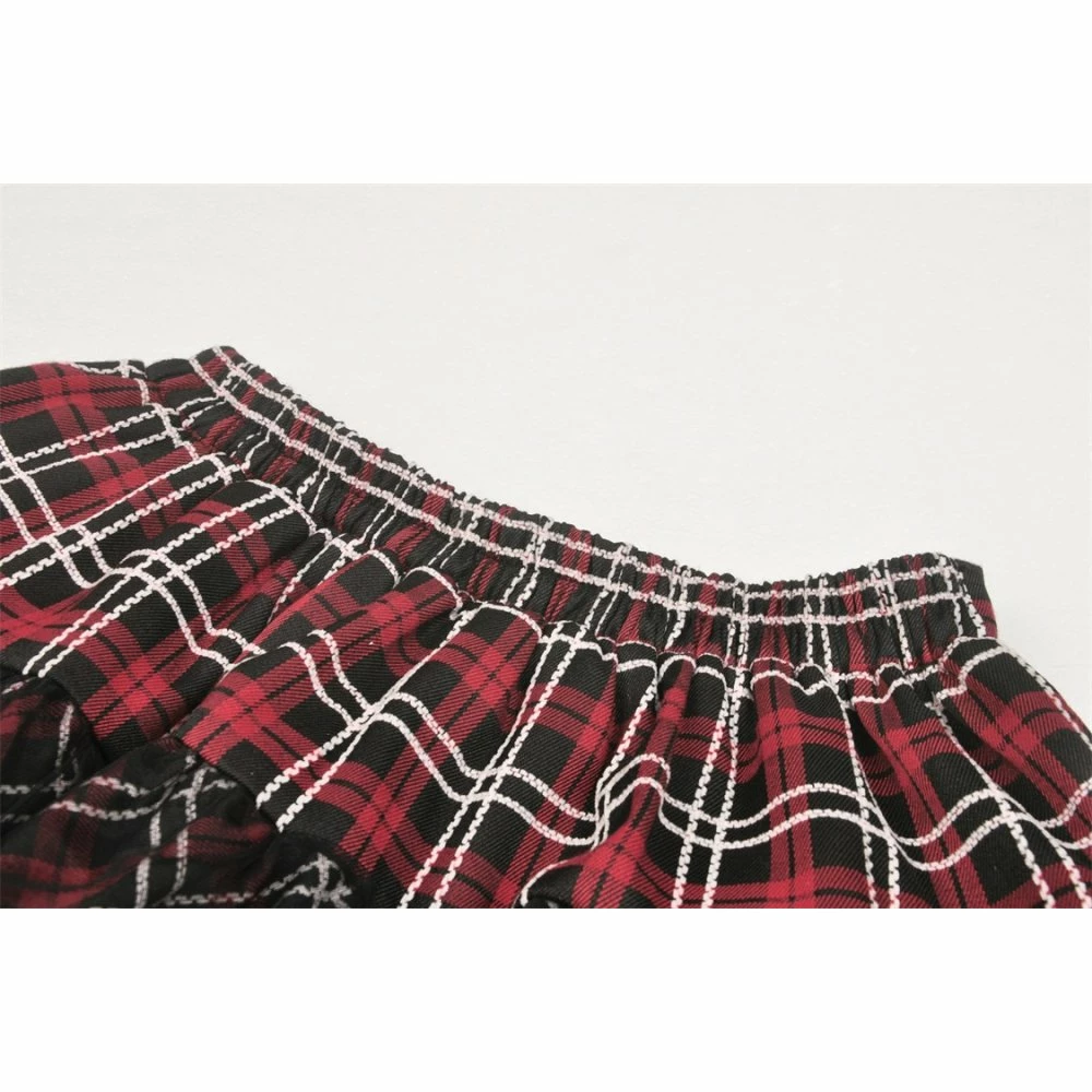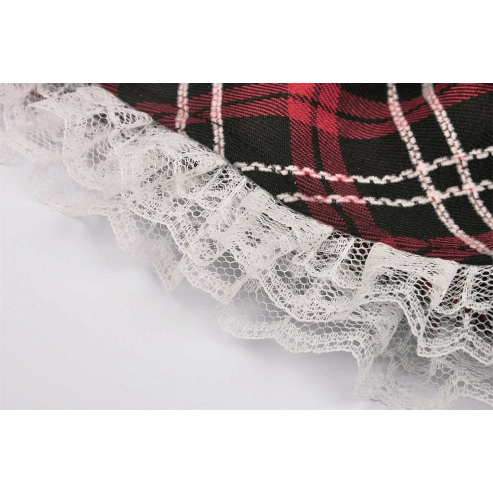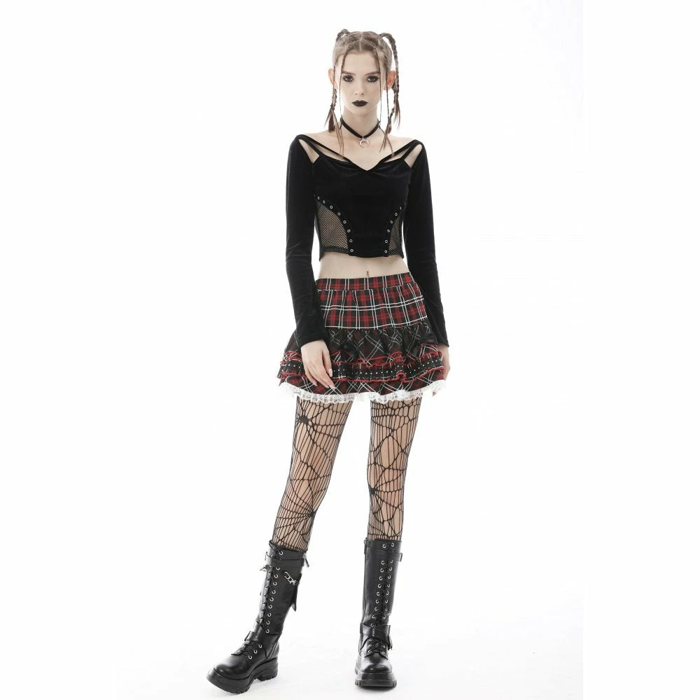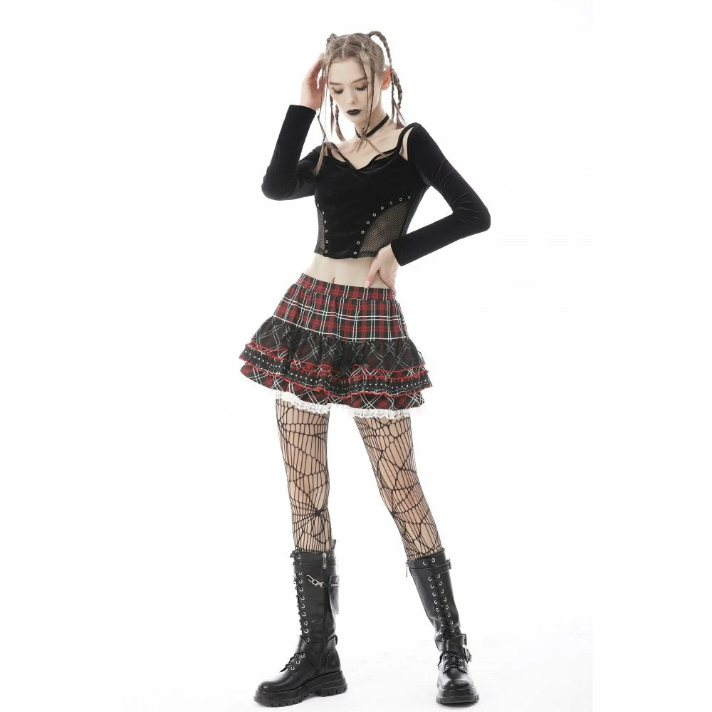Stunning and sexy punk tartan mini skirt from Dark in Love. This amazing skirt features red, white and black plaid fabric with mesh detailing. Looks amazing on!