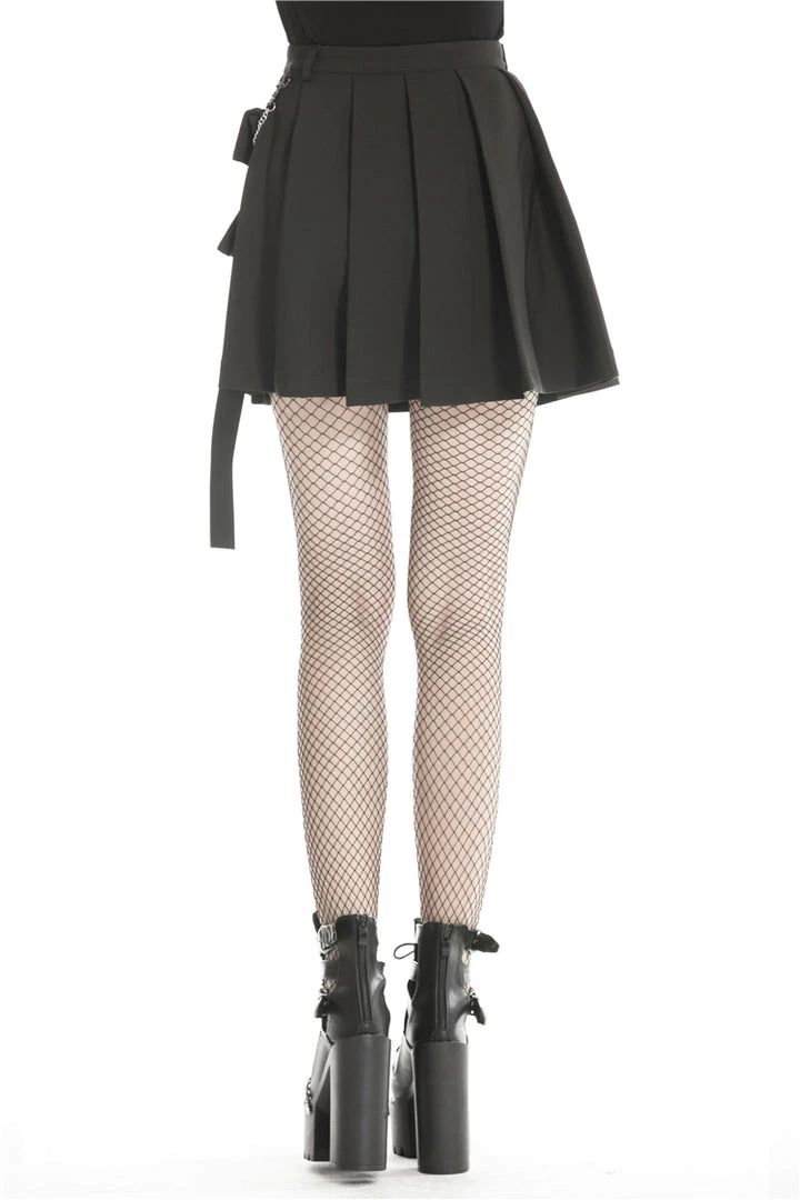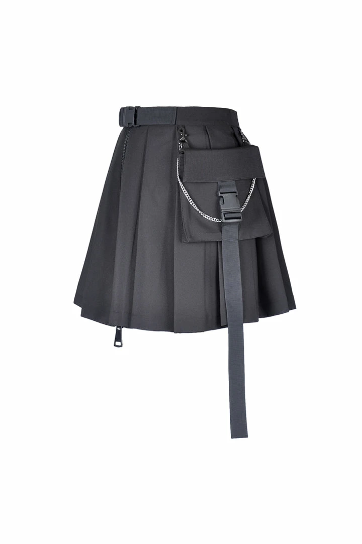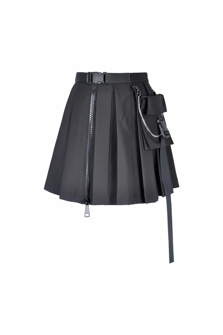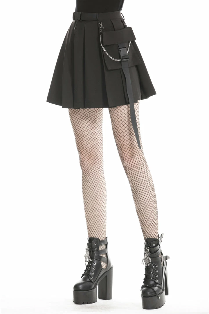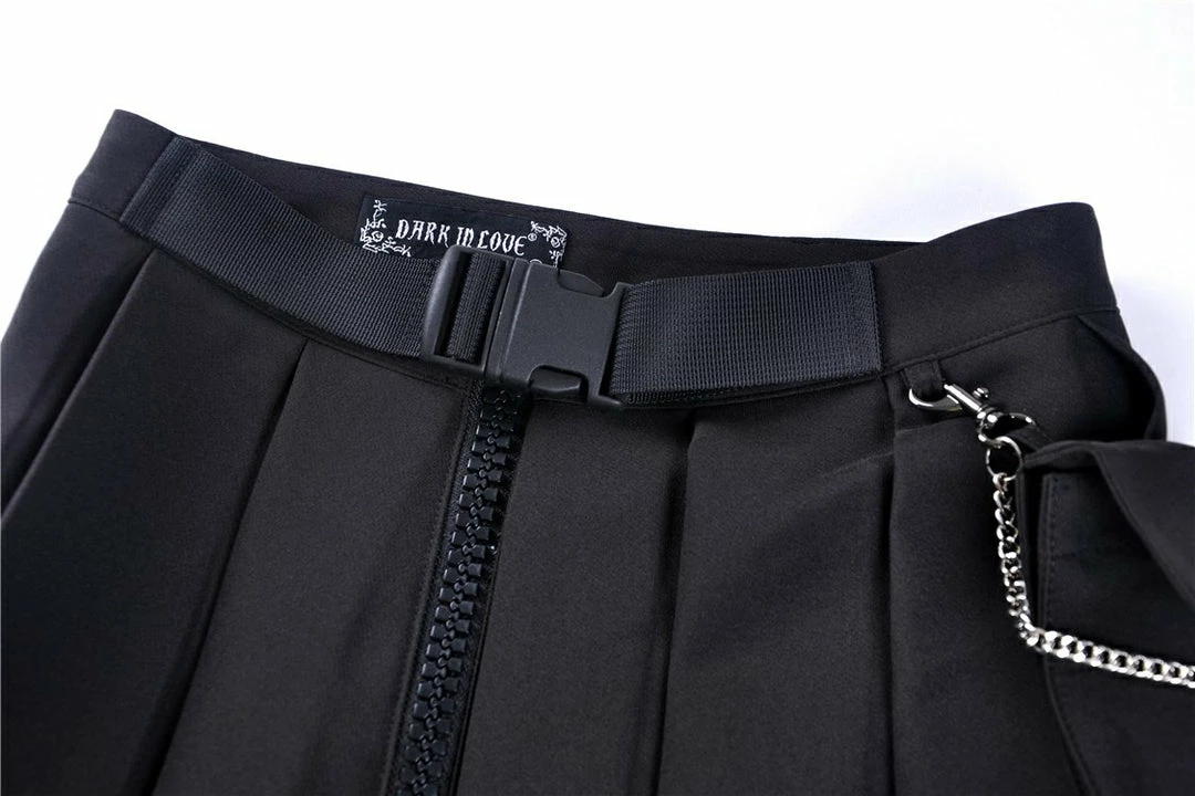 This fabulous pleated skirt from Dark in Love features a full length chunky front zip with fixed waist belt, detachable bag with buckle closure and decorative chain. Perfect for everyday wear or dress up for nights out. For the perfect fit and fabric composition, please see Dark in Loves size guide in the images.