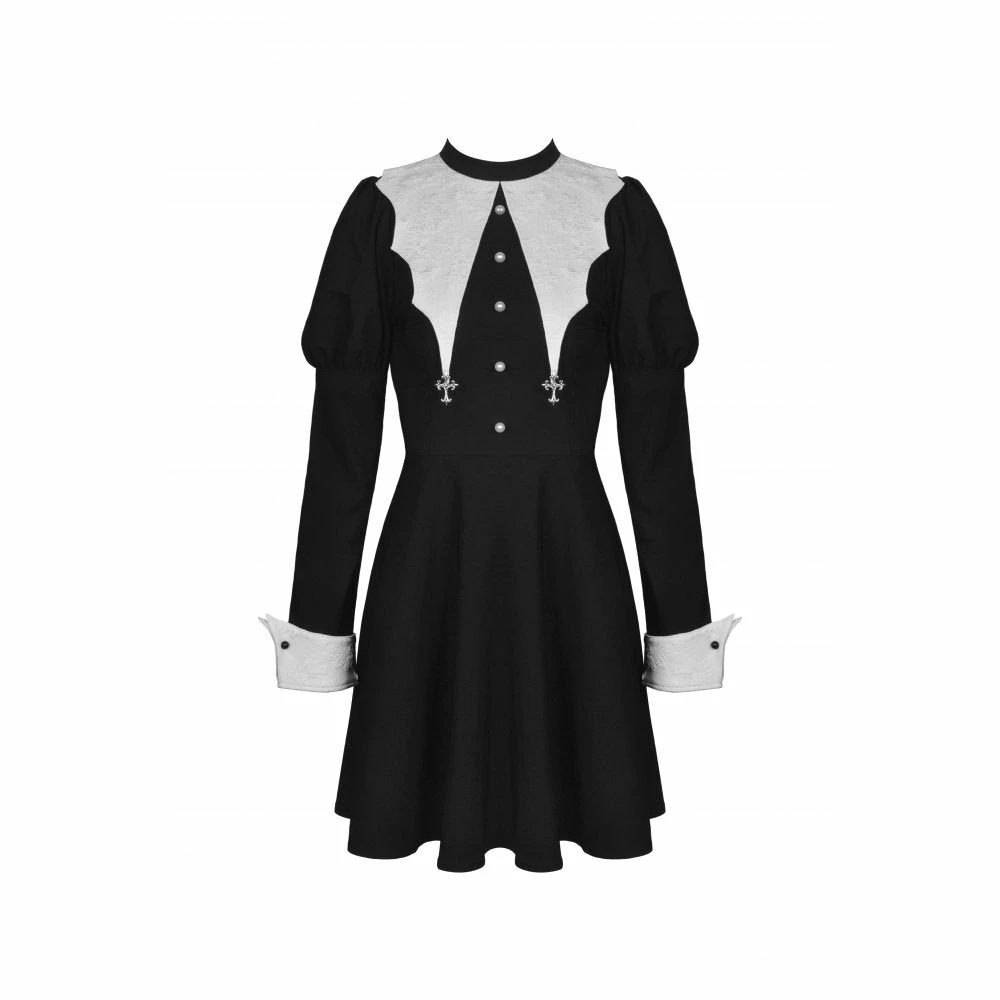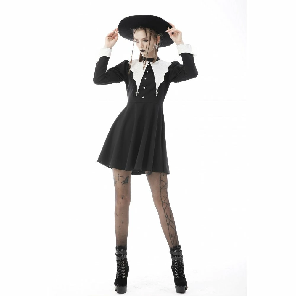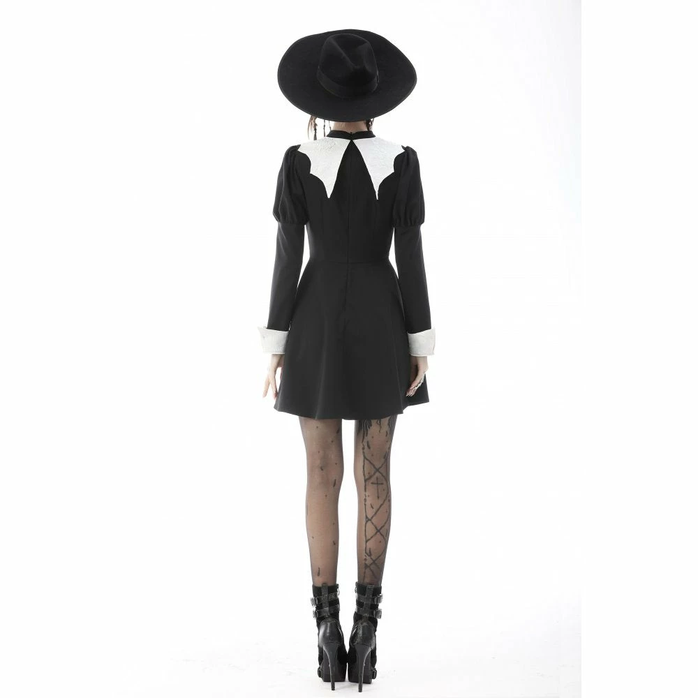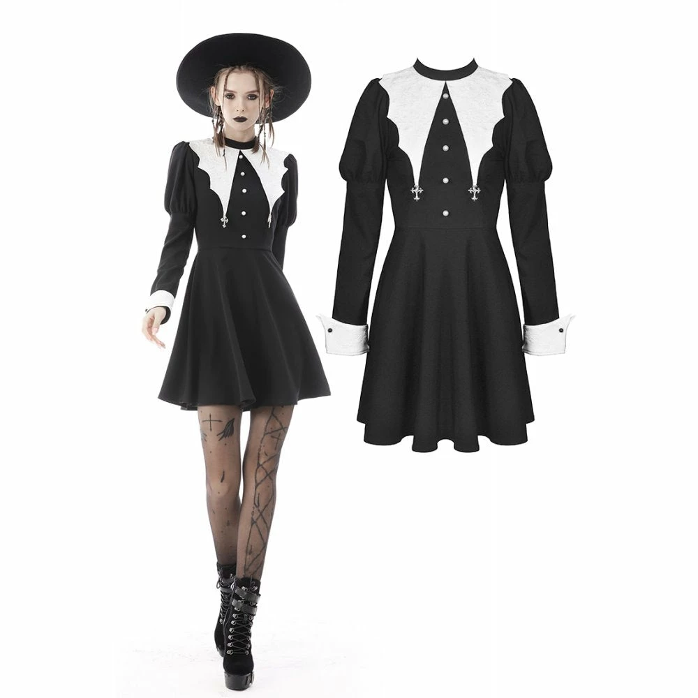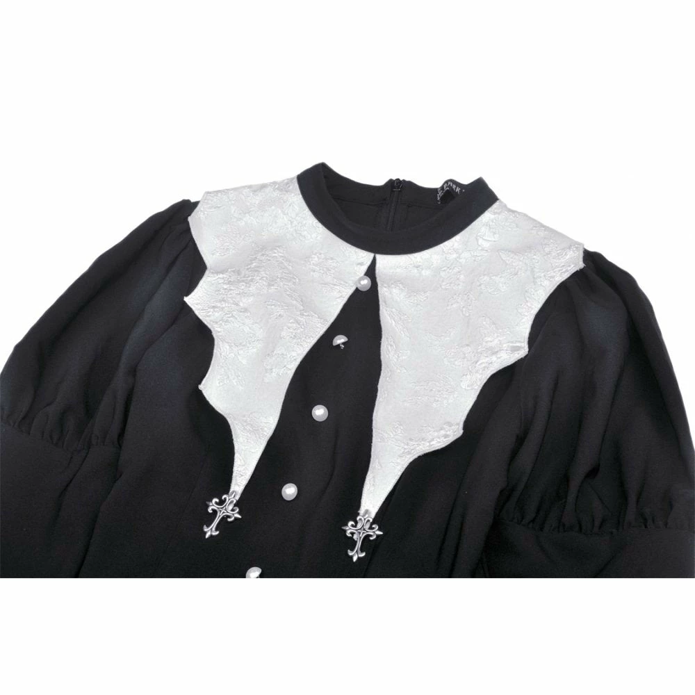 Beautiful puff sleeve dress by Dark in Love, featuring a contrasting white bat wing shaped collar coming down from a crewneck with cross pendants on the ends. With contrasting white cuffs and buttons, this gorgeous dress fastens with a concealed zip to the back.