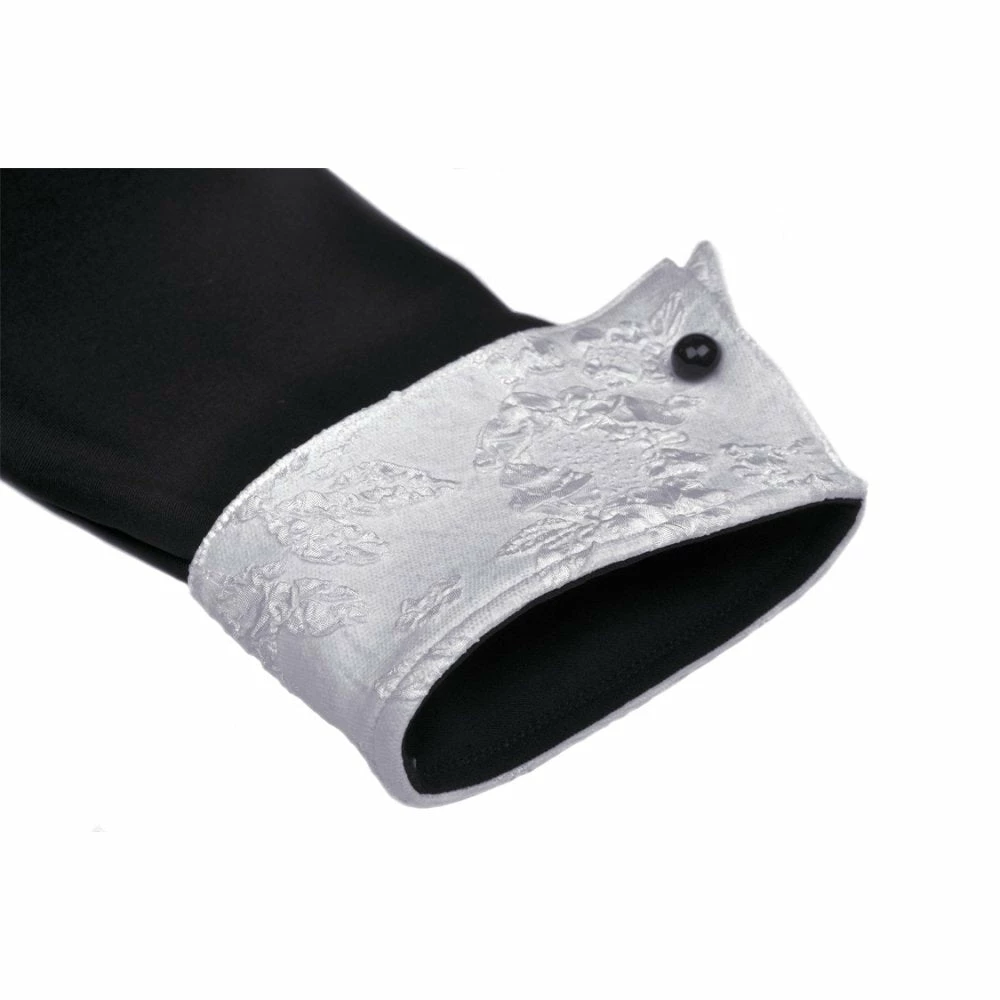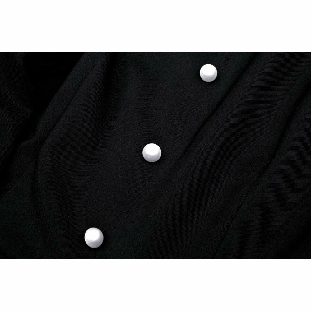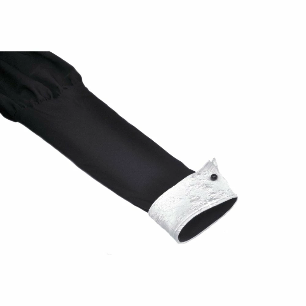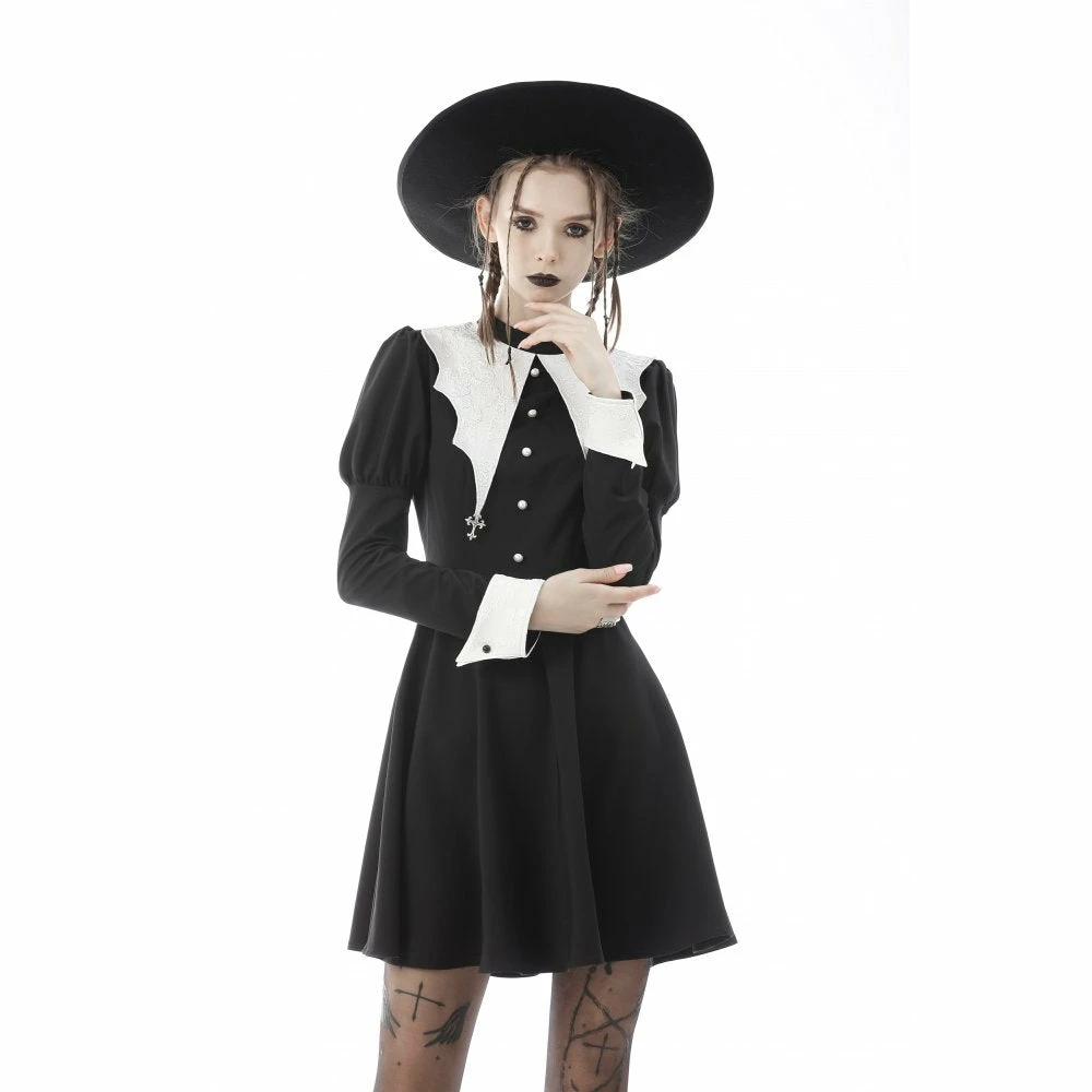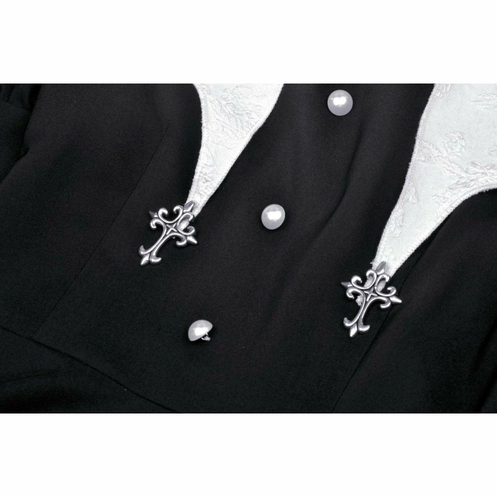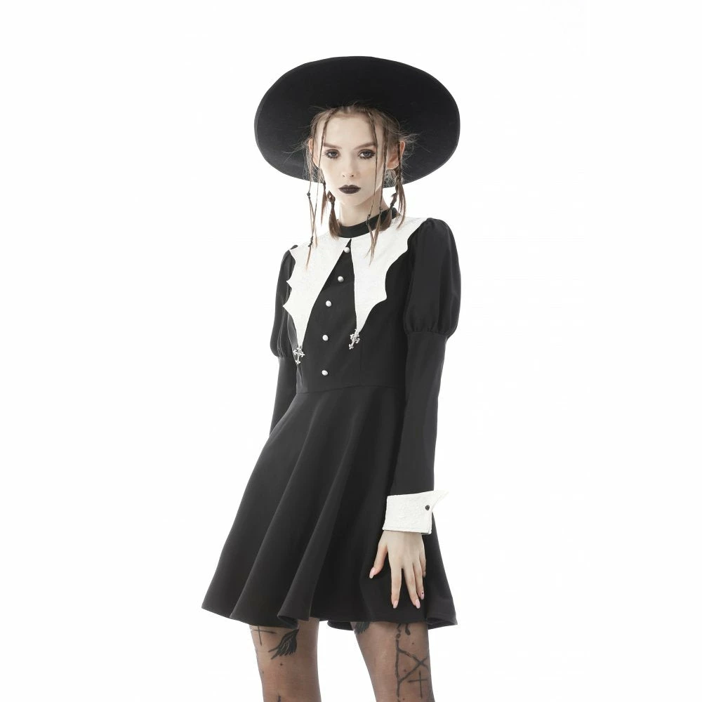 Beautiful puff sleeve dress by Dark in Love, featuring a contrasting white bat wing shaped collar coming down from a crewneck with cross pendants on the ends. With contrasting white cuffs and buttons, this gorgeous dress fastens with a concealed zip to the back.