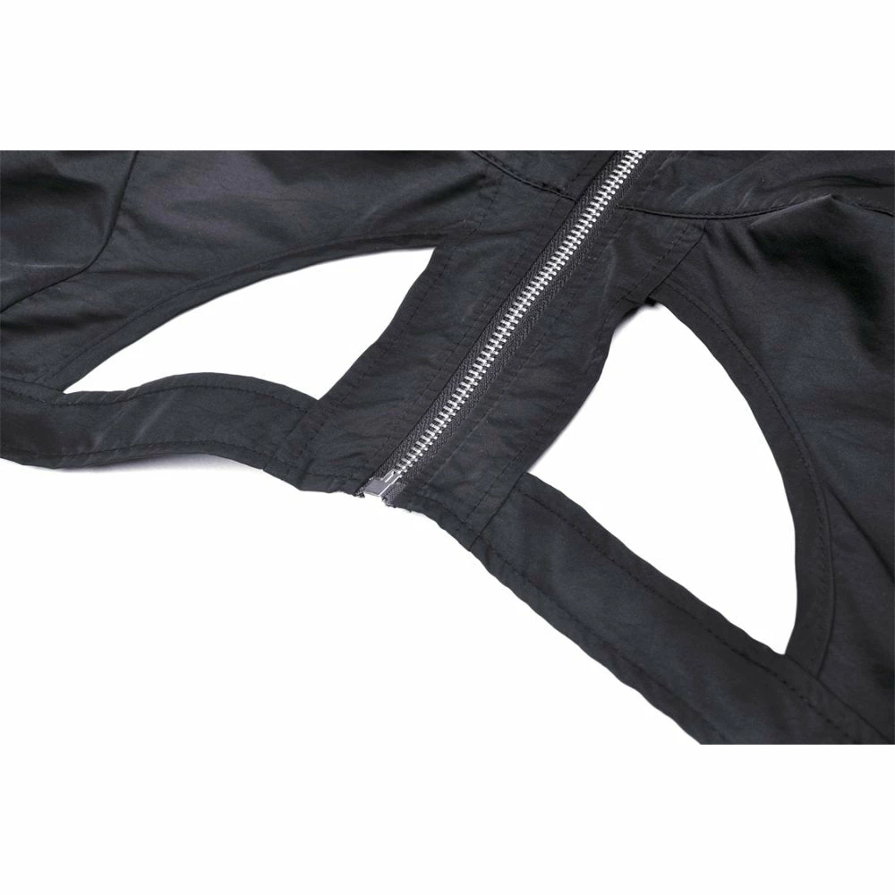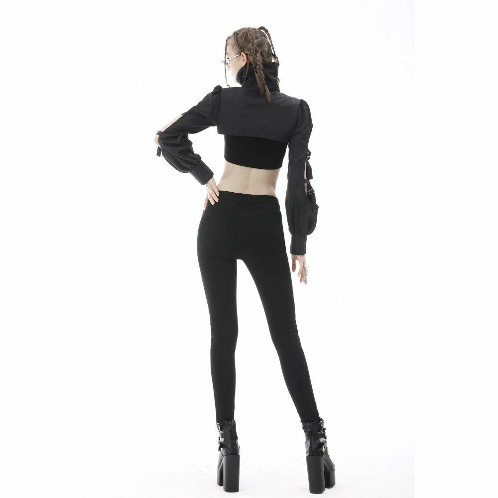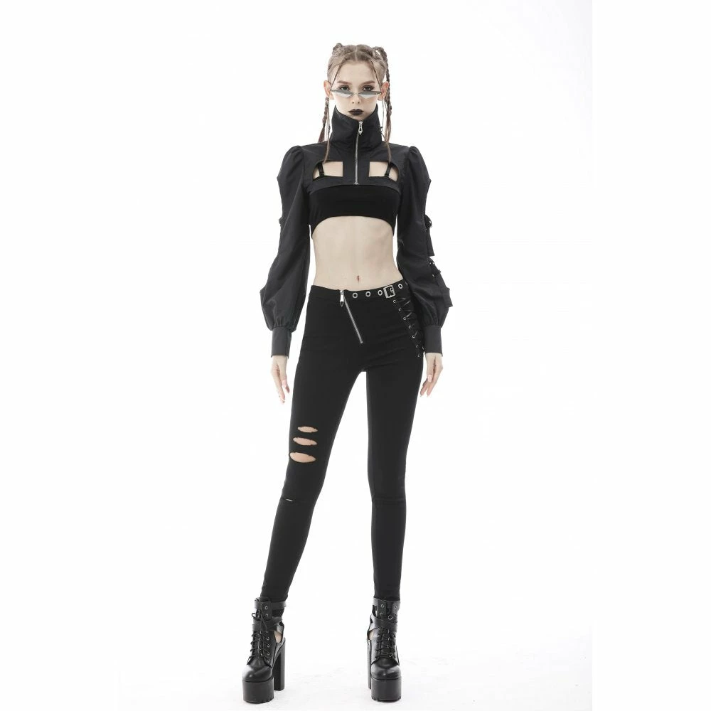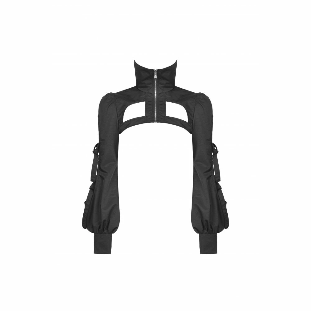 Amazing zip up black cape with cut outs in the chest and sleeves from Dark in Love. This stunning black cropped jacket features front metal zip and long ruffle sleeves with straps detailing for a stand out cover up!