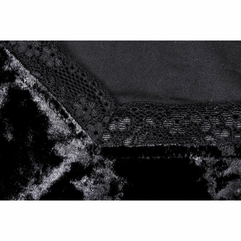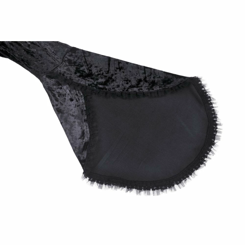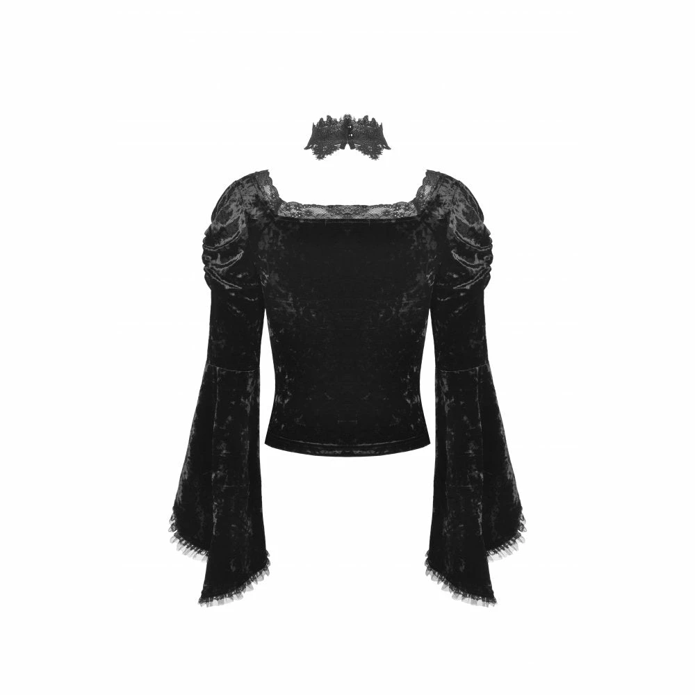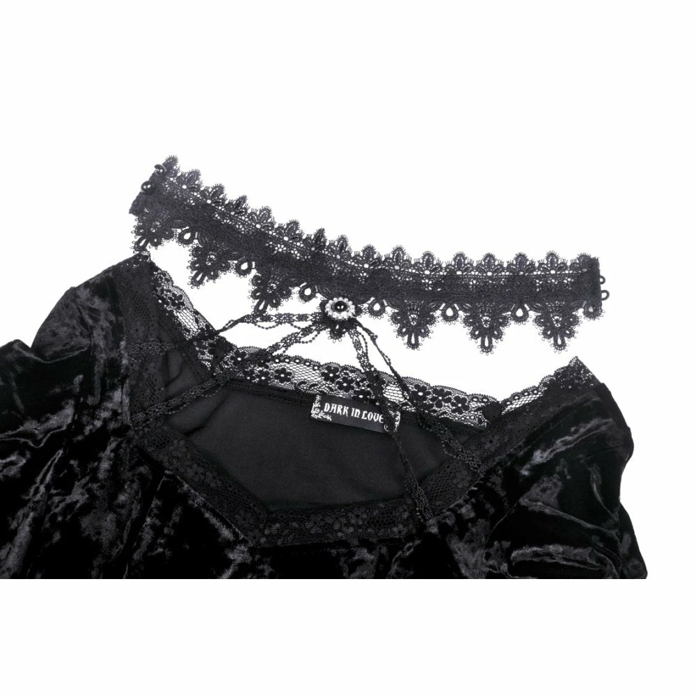 Stunning soft velvet top from Dark in Love featuring long bell sleeves with ruched effect detail on the upper arms and lace trim to the neckline. The gorgeous embroidered lace choker fastens at the back with black dome buttons and is attached to the neckline with delicate lace straps. For the perfect fit please see Dark in Loves size guide in the images.