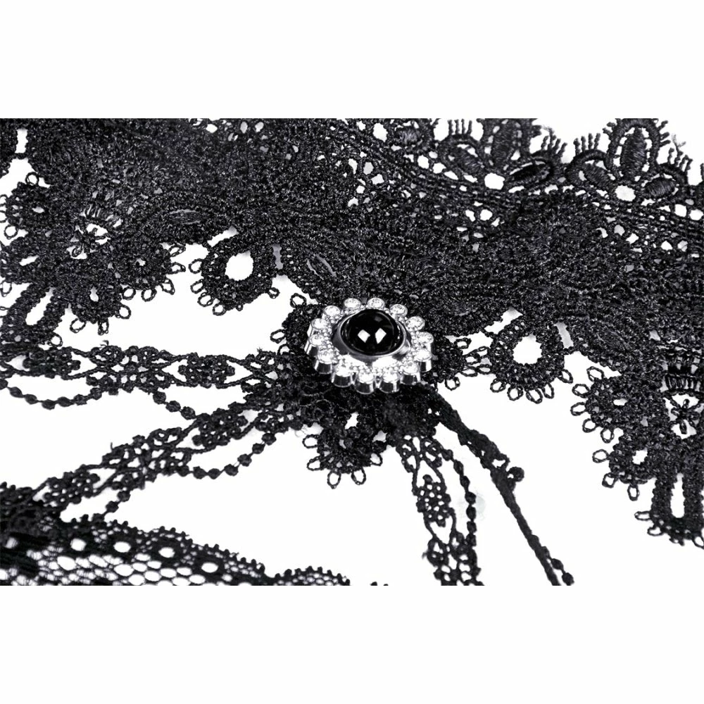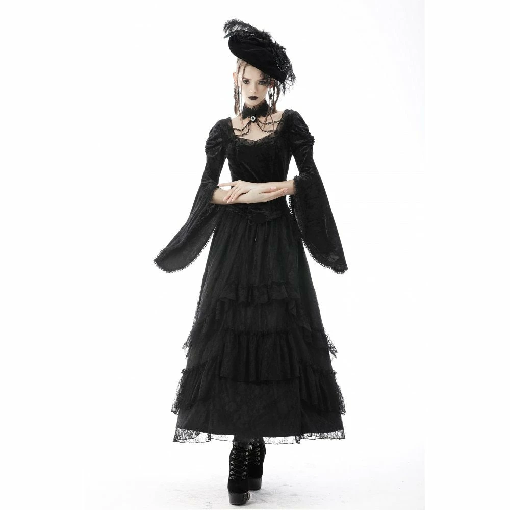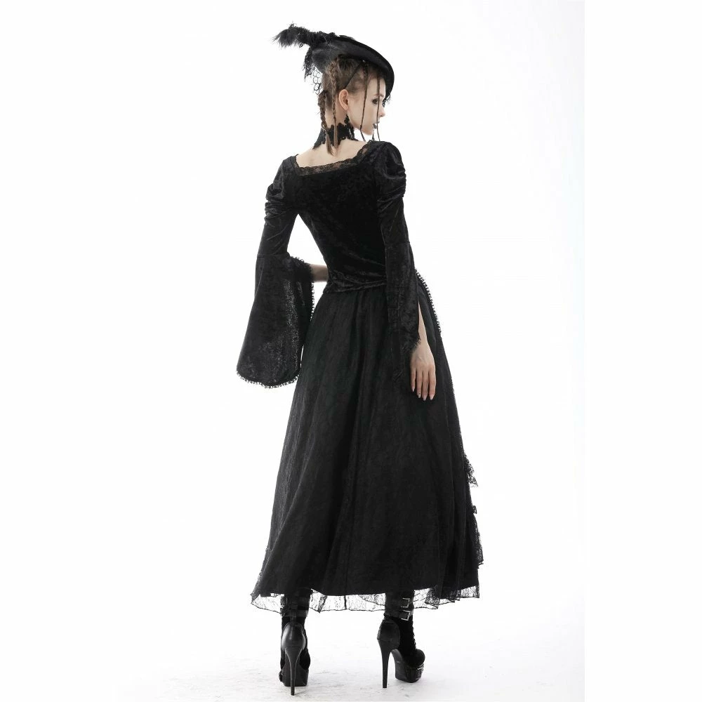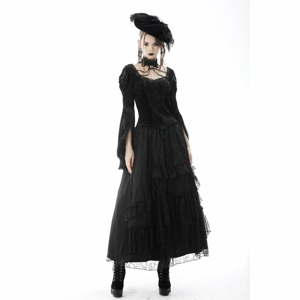Stunning soft velvet top from Dark in Love featuring long bell sleeves with ruched effect detail on the upper arms and lace trim to the neckline. The gorgeous embroidered lace choker fastens at the back with black dome buttons and is attached to the neckline with delicate lace straps. For the perfect fit please see Dark in Loves size guide in the images.