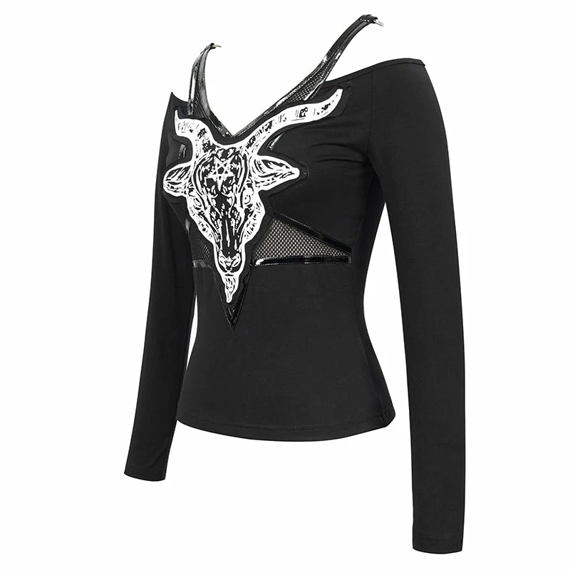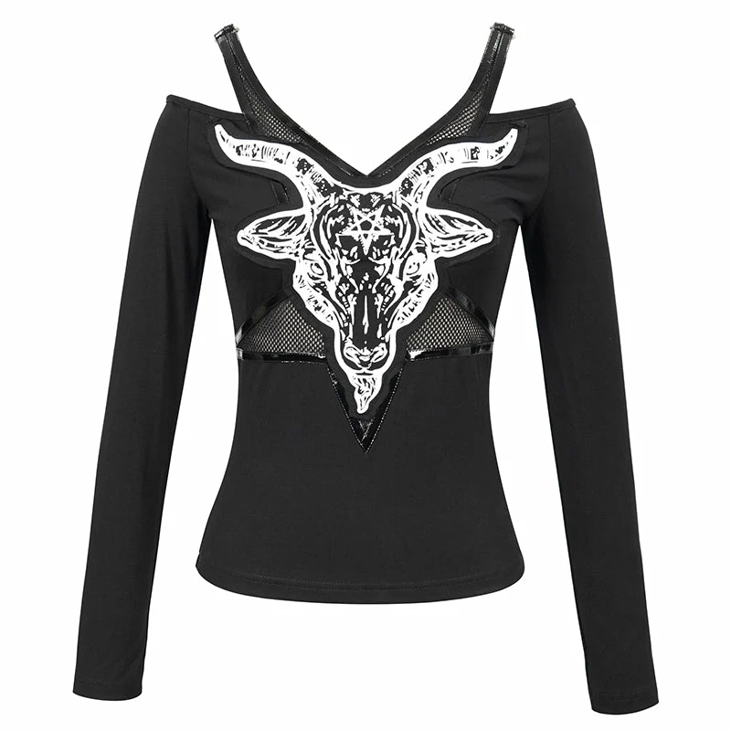 Amazing black long sleeved top from Devil Fashion featuring cutout styling with white contrast Baphomet print. This stunning top is made from a stretchy lightweight cotton fabric that is fitted to show off your curves. This edgy black top features cold shoulders, mesh panels and pentagram detailing for a stand out style that looks amazing whatever you pair it with!