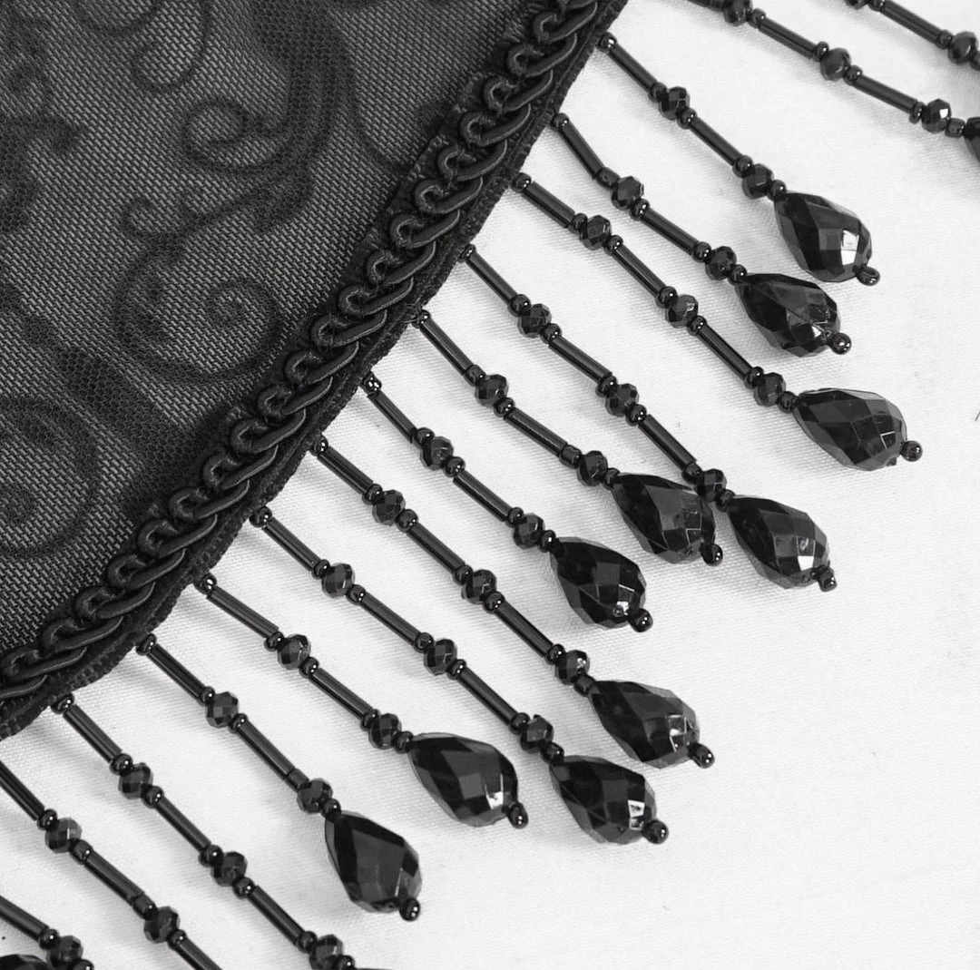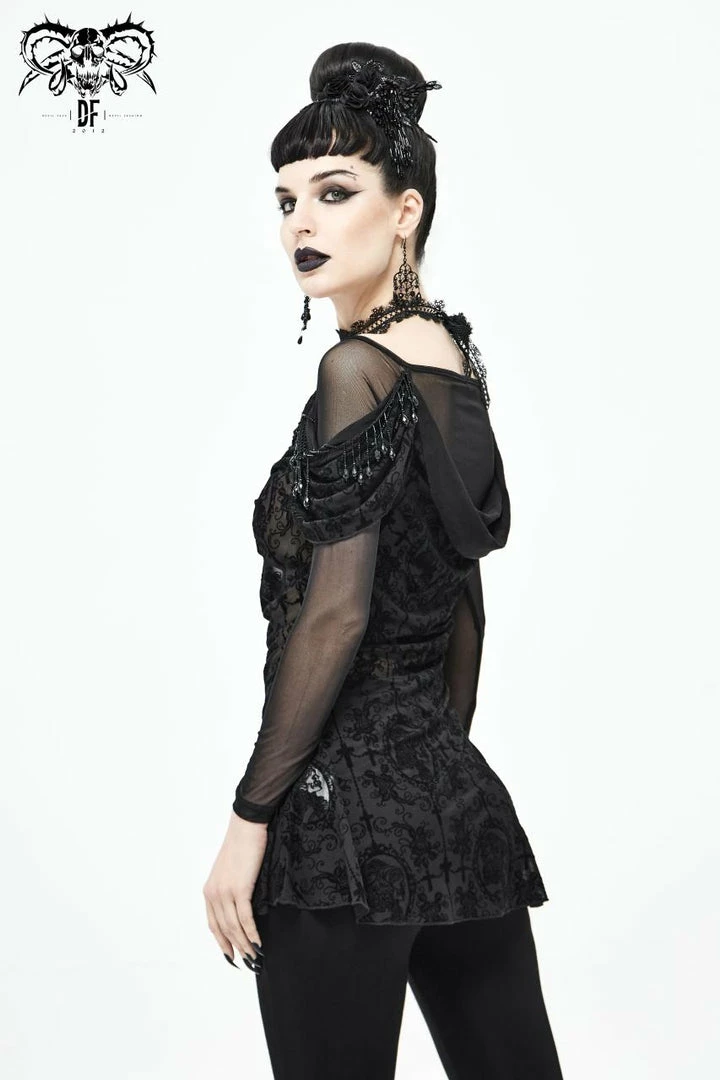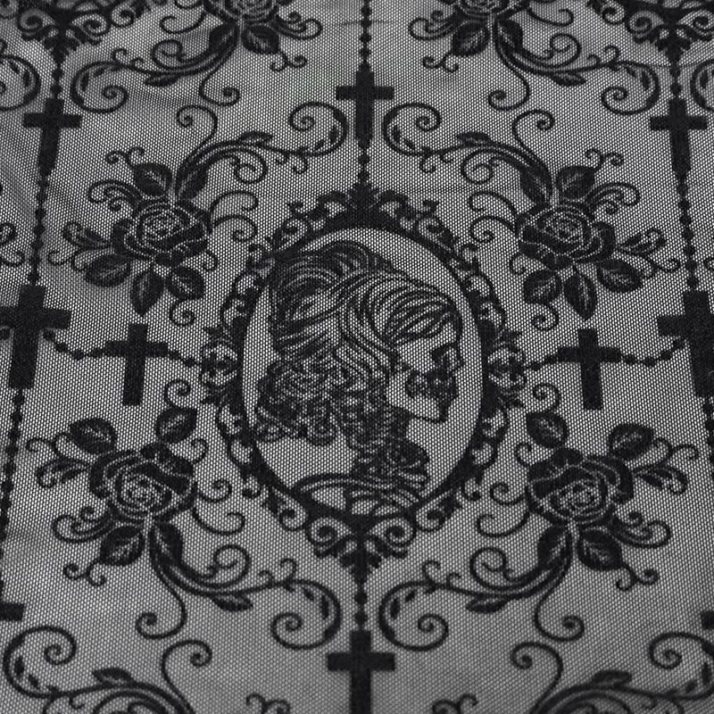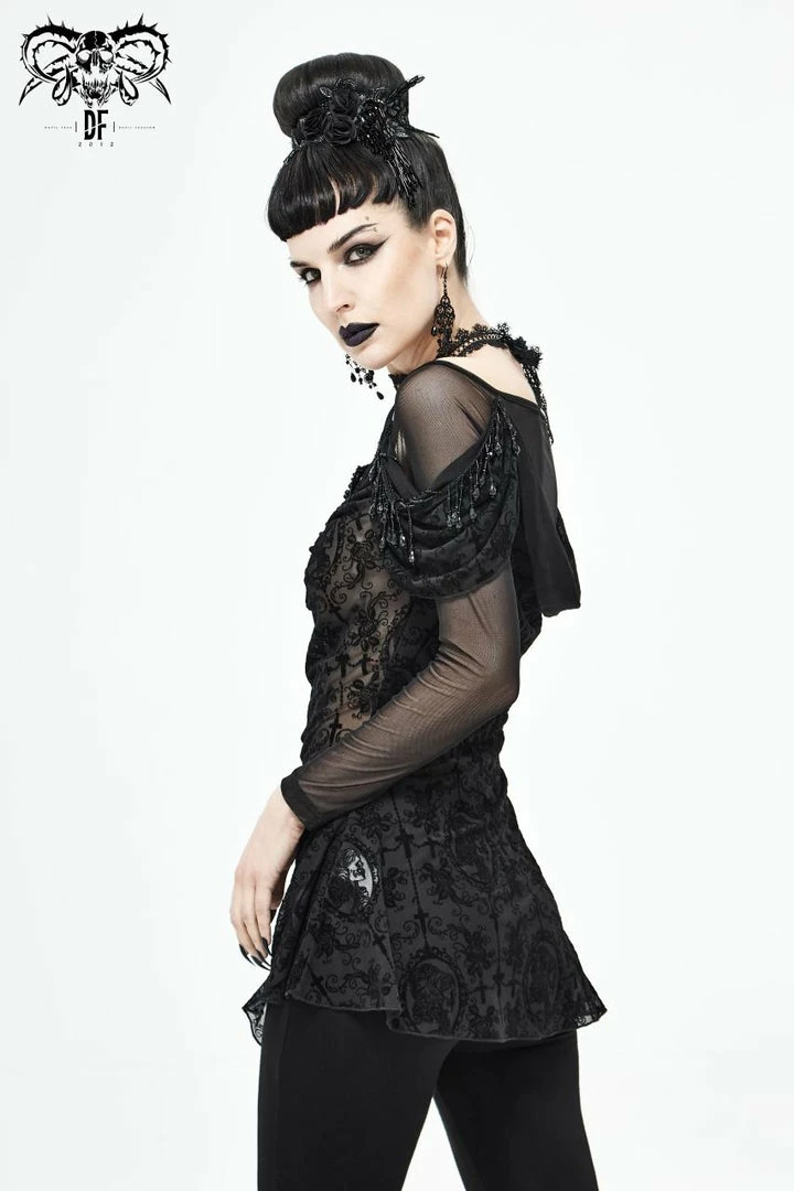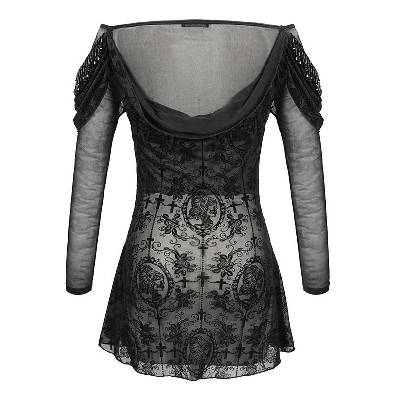 Gorgeous mesh top from Devil Fashion featuring long mesh sleeves with swags to the upper arms and beaded fringe detail. A velvet embossed baroque pattern with skull cameo’s and crosses to the body with a beaded applique under the bardot neckline. For the perfect fit please see Devil Fashion’s size guide in the images.