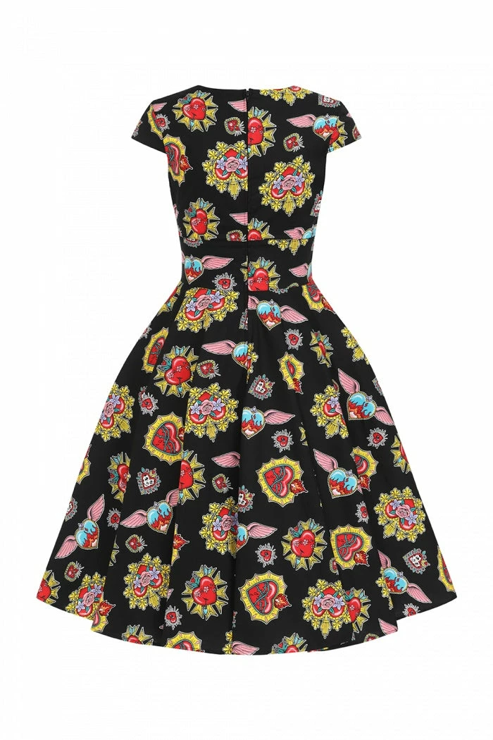 Beautiful black stretch cotton midi dress with colourful print from Hell Bunny in a glamorous fit and flare style. This gorgeous dress has pockets in the seams and features a sweetheart neckline with fitted waist and short cap sleeves. The print is a colourful heart design and the dress has a zip fastening in the back. This dress looks awesome on and has a stylish vintage vibe!