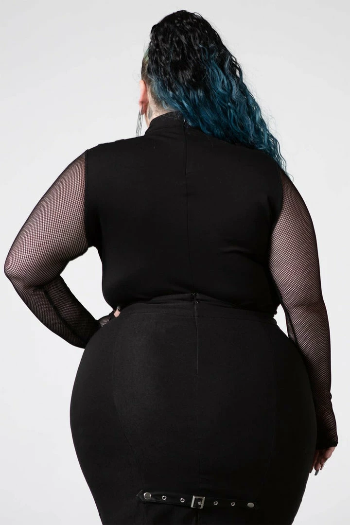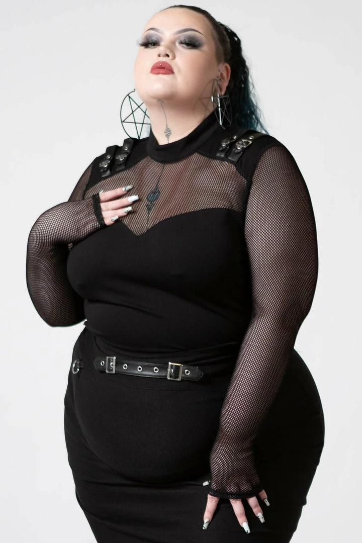 Striking and sexy black long sleeved fishnet top from Killstar made from a stretch mesh fabric. This seductive body hugging black fishnet top will show off your curves to perfection with some extra attitude and also features a high neck with silver hardware on the shoulders.
