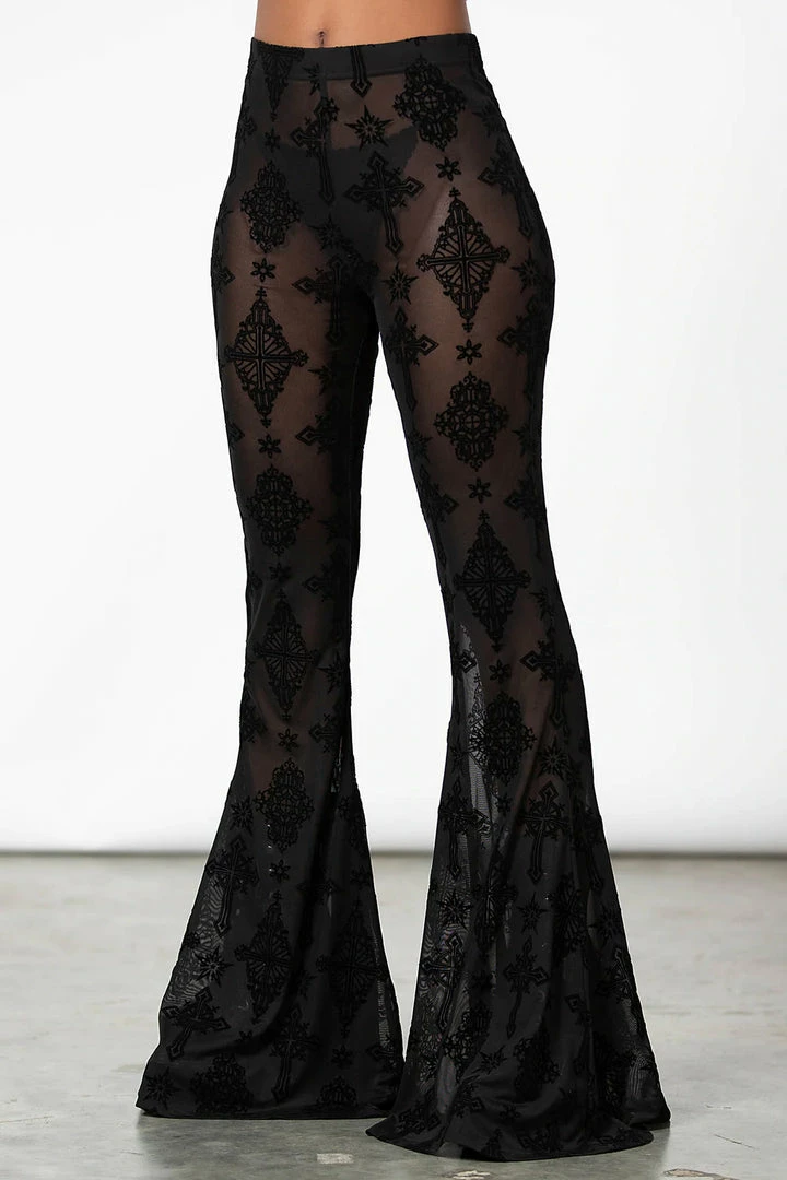 You’ll love these stunning black mesh bell bottoms from Killstar made from soft stretch sheer mesh fabric with an elasticated waistband. These seductive see-through flares are fitted to flaunt your figure and have a statement flocked cross pattern that look amazing on a night out!