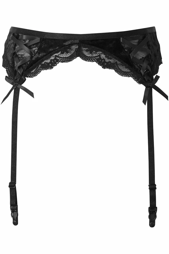 Killstar Cardinal Sins Black Garter Belt is made from a delicate lace fabric with adjustable suspender straps. This seductive piece features entrancing lace up detailing and intricate bows and trims. Match with the Cardinal Sins Bralet and pantry for the ultimate temptress look!