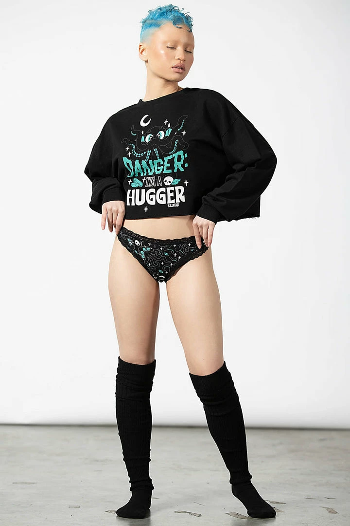Playful and stylish black cropped sweater with awesome contrast Cthulhu print by Killstar. This terrifyingly adorable top is made from a super soft cotton fabric with long sleeves and “Danger I’m a Hugger” script. This fun and comfy pullover features a fun print and matches perfectly with other items from the Cthulhu collection!