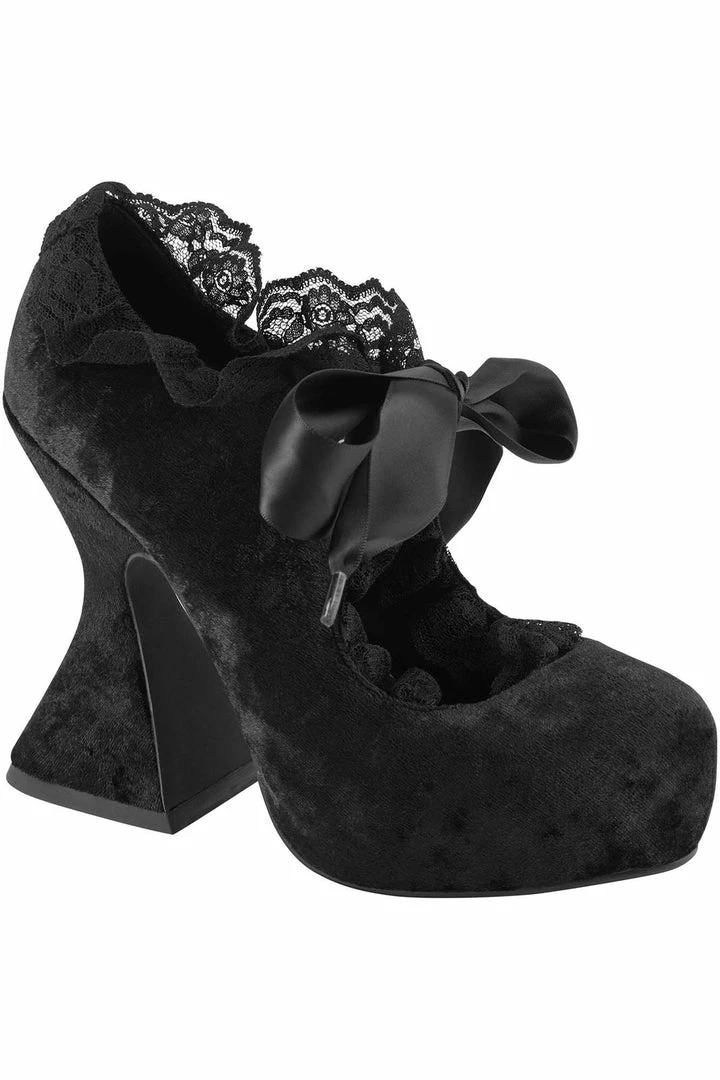 Killstar Daemon Mind Black Heels. Made from a gorgeous velvet fabric with statement heel and pussy bow, these high heeled shoes are eye catching and stylish. A must-have for your wardrobe, these beauties will elevate the look of any outfit!