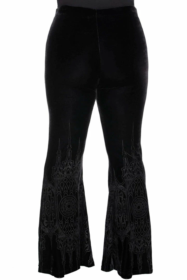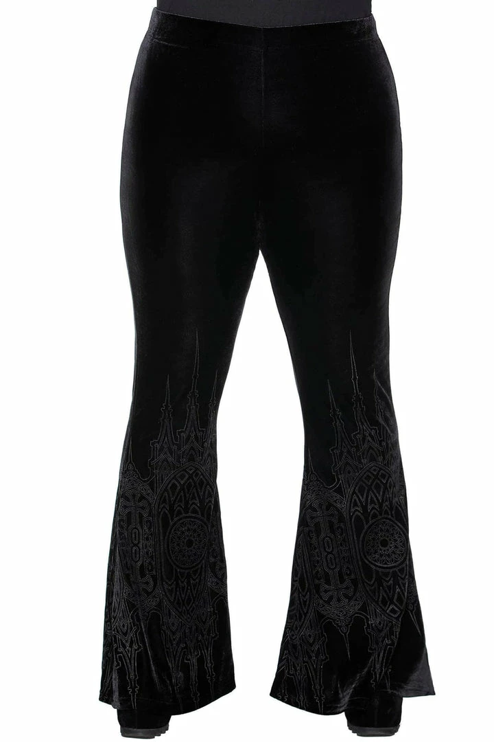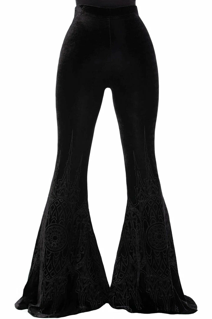 These gorgeous black flares from Killstar are made from a luxuriously soft stretchy embossed velvet fabric with statement pattern that will give you the ultimate comfort and fitted style. These must-have black velvet trousers feature an fitted waistband, extra long length and flared style! Dress them up or down!