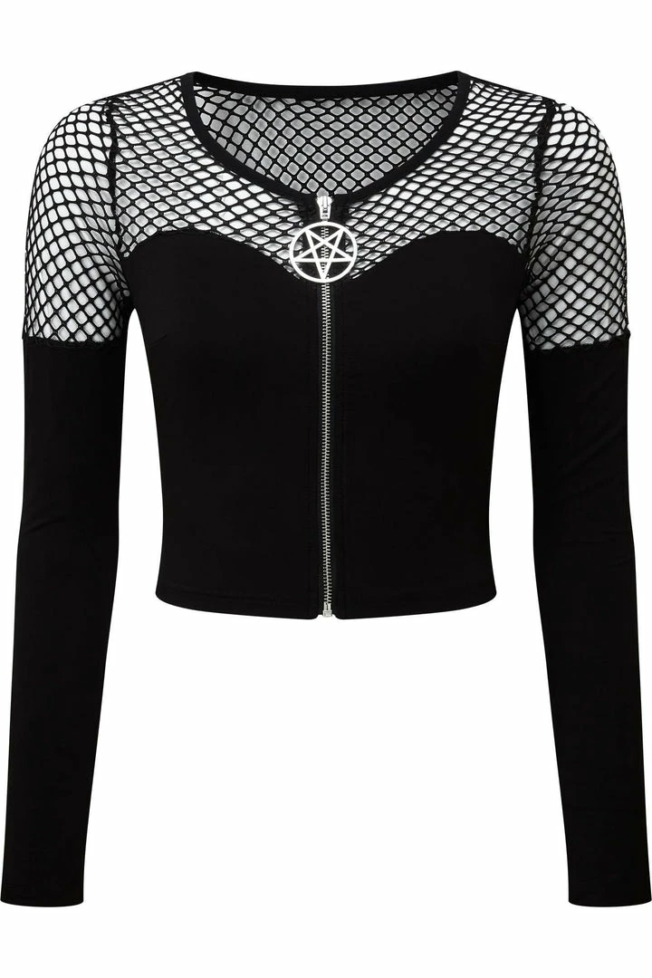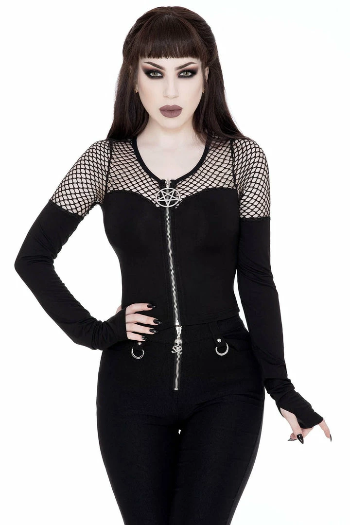 Hell yeah – Fishnet! The ‘Dee Mony’ long sleeve top from Killstar is composed of super-soft fishnet and statement jersey body, extra long sleeves and low neckline with zip-up front and pentagram hardware. Slightly cropped – easy to wear and very versatile.