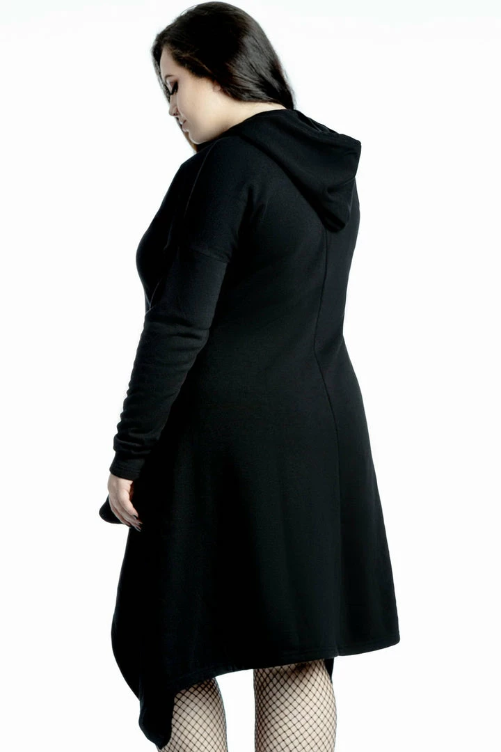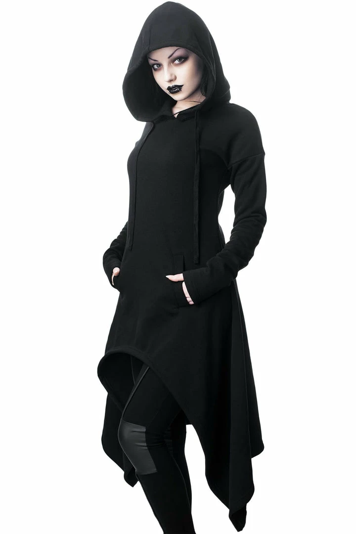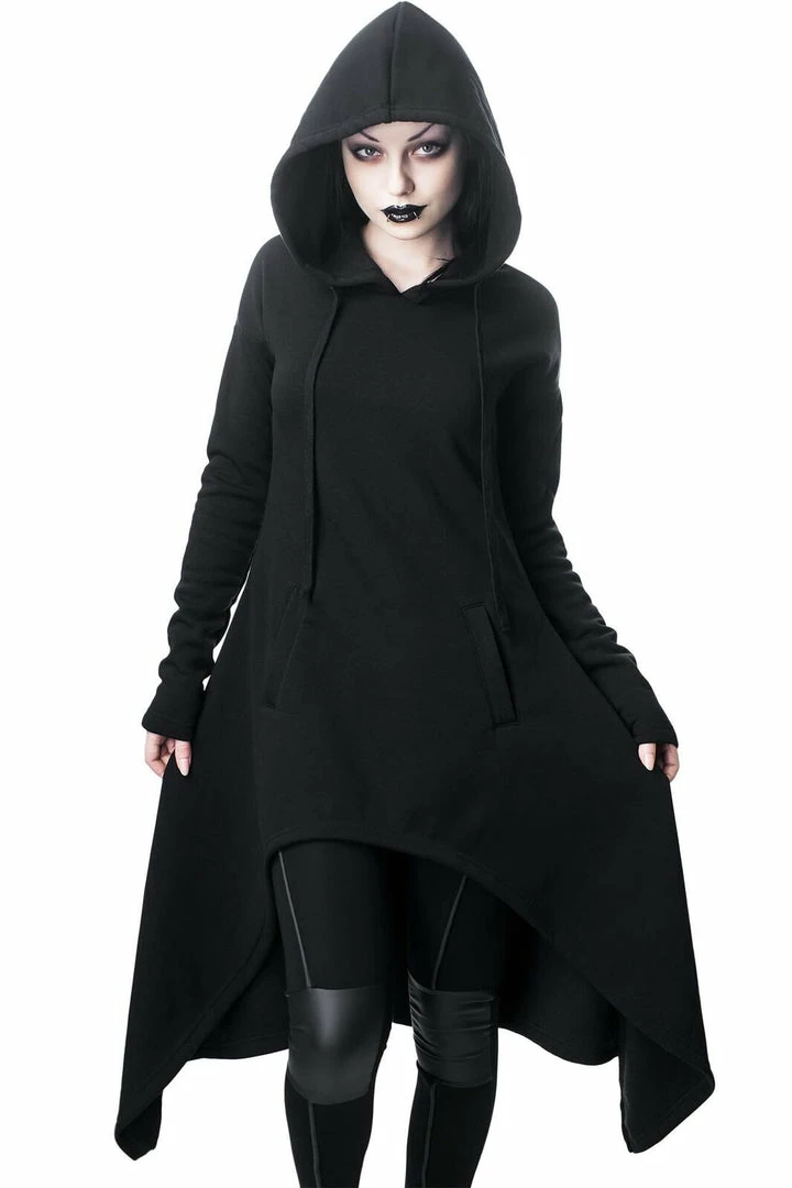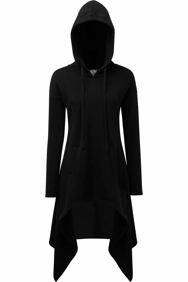 The cozy ‘Dungeoness’ super-soft jersey hood-dress from Killstar features a fitted longline body, oversized hood with drawstrings, extra-long sleeves, front pockets and hanky hem statement for some extra drama. A best-of-both-worlds basic; equally perfect for lounging as it is for a night out!