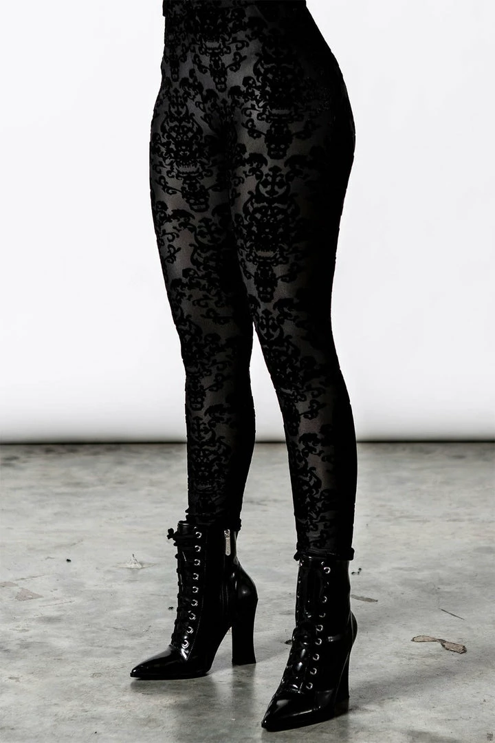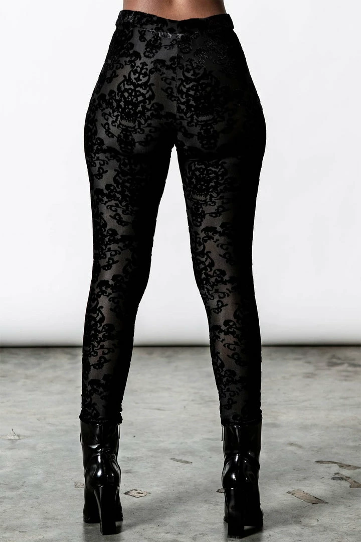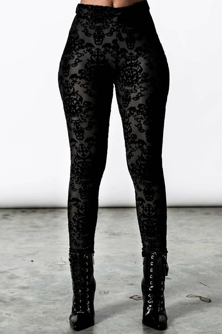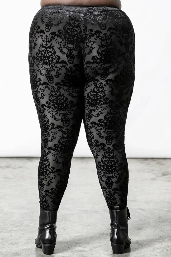 Stunning black velvet leggings from Killstar! These must-have leggings are made from a soft stretchy burnout velvet fabric for a comfortable figure hugging look! These gorgeous leggings will look great with everything and feature a wide waistband and statement pattern!