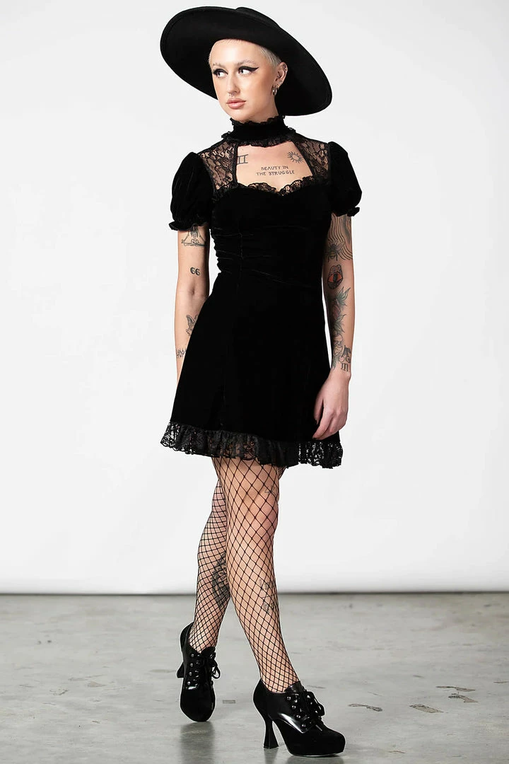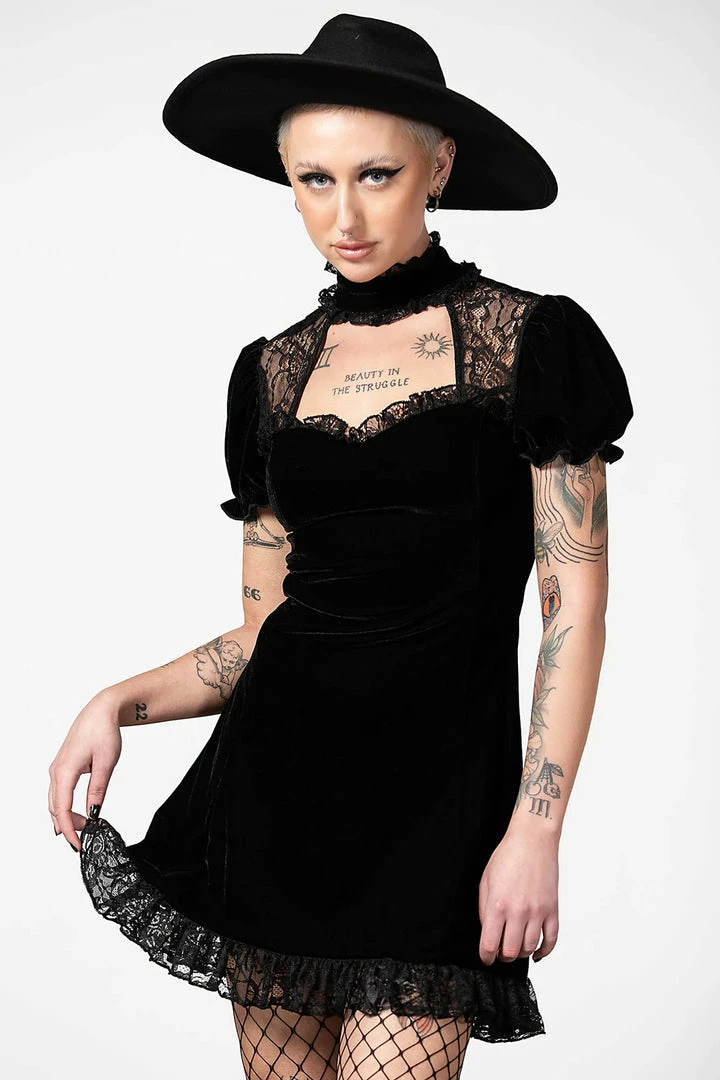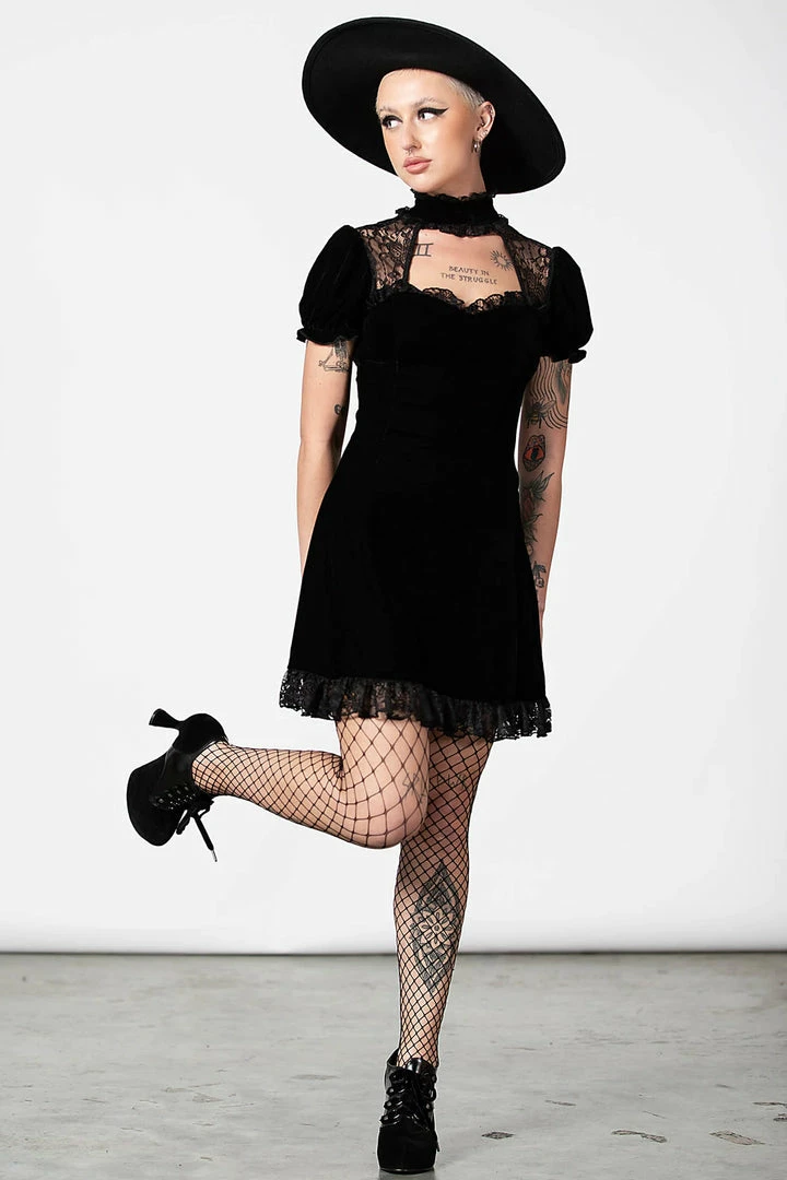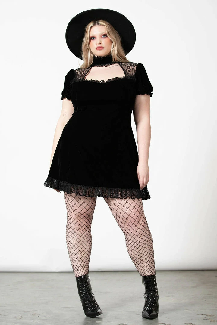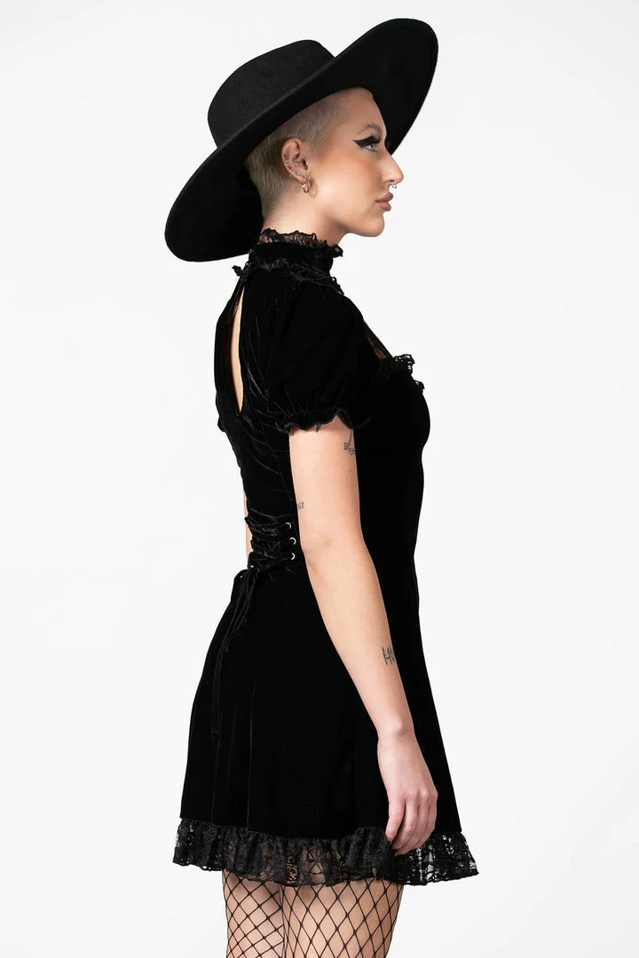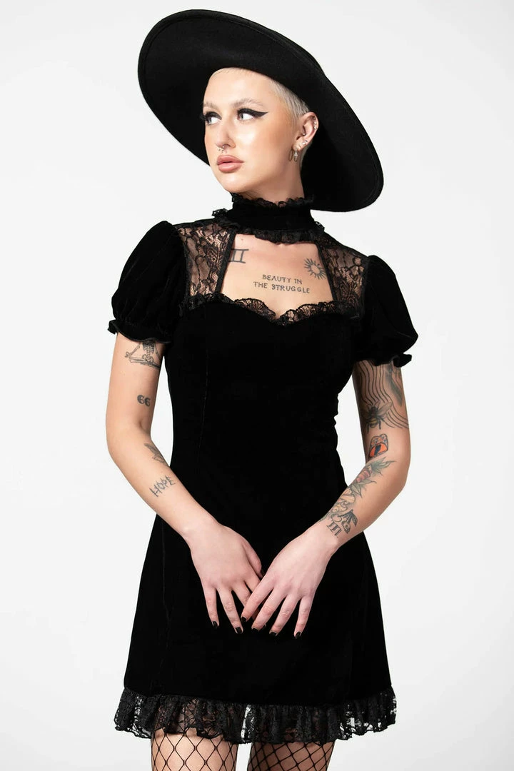 Showstopping black velvet mini dress with keyhole and ruffle collar from Killstar! This stunning LBD is made from a luxury soft stretchy velvet fabric that is fitted to accentuate your figure. This amazing black party dress features a high neck with keyhole cutouts and lace inserts and short puff sleeves. Beautiful and glamorous, this dress has an A line style with back corset and flowing skirt with lace trim hem.
