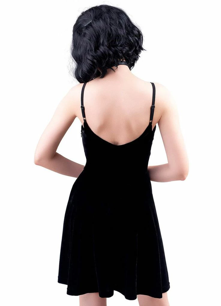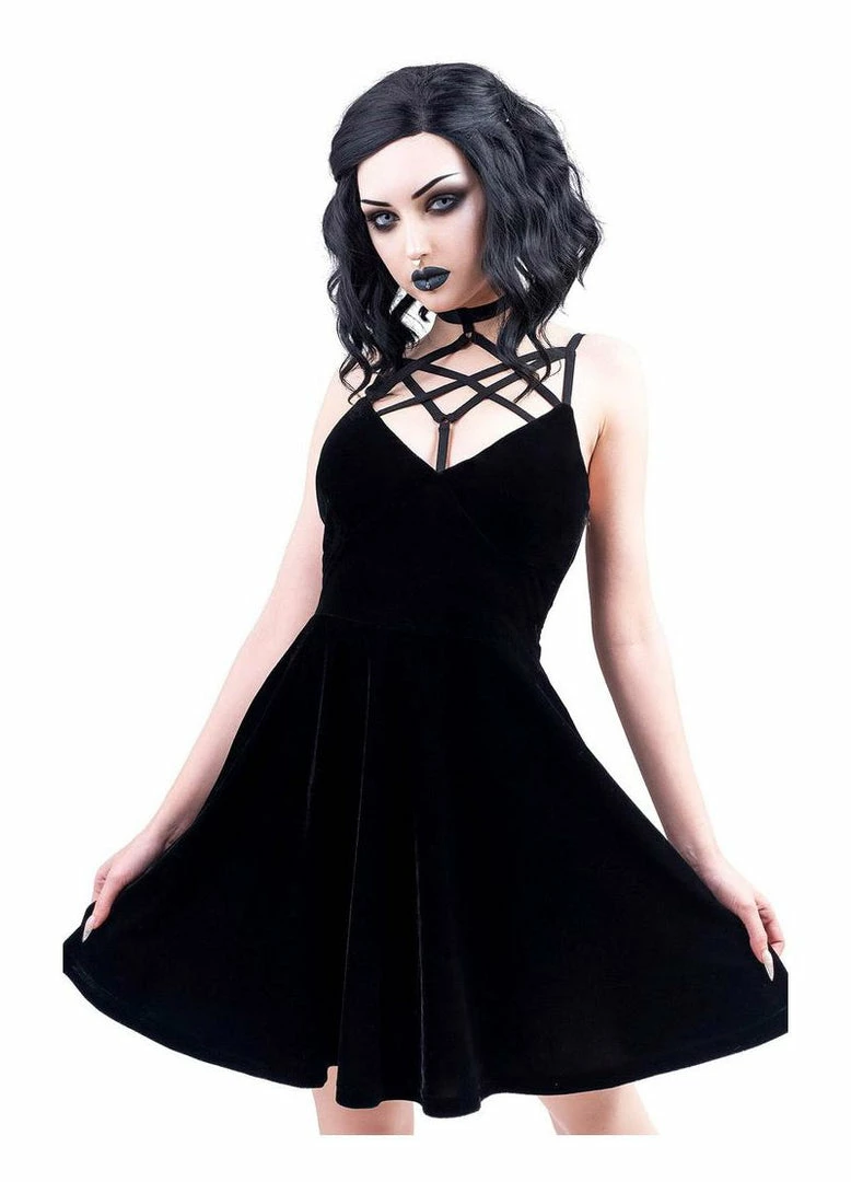 Sumptuous black velvet mini dress from Killstar! The stunning Magica skater dress features a statement hexagram strap choker neckline as well as a super flattering skater style cut. With adjustable shoulder straps and a low cut back, this lovely dress looks amazing on.