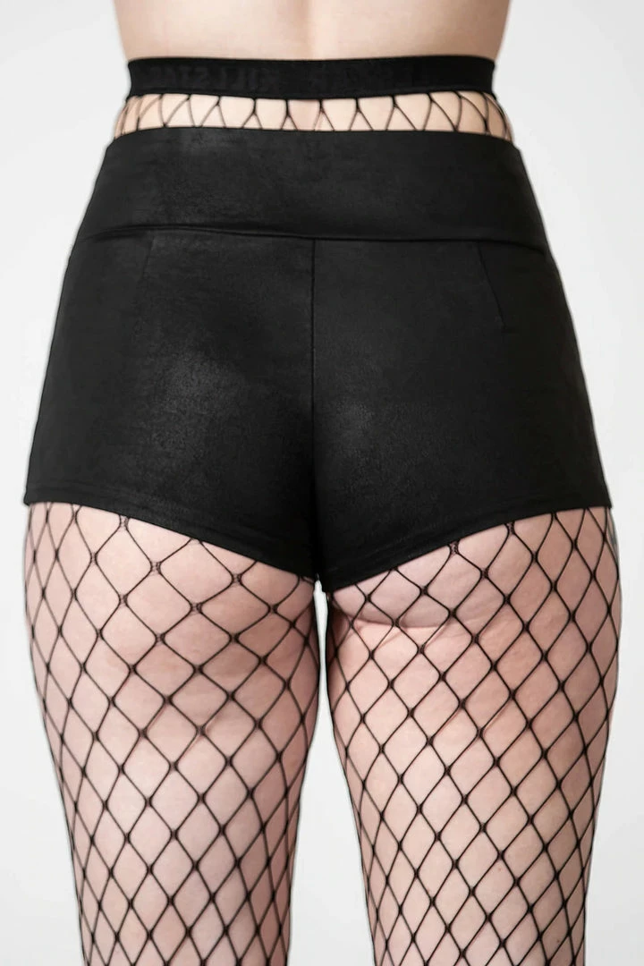These gorgeous stretchy black hotpants from Killstar are made from a soft textured suede look fabric and fitted for a stunning look that is sure to turn heads! These sexy black faux suede hotpants feature a wide waistband and statement O-ring hardware for a sultry bondage style.
