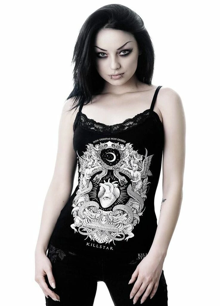 The gorgeous Never Surrender vest from Killstar features a stunning contrast graphic print on the front. With a delicate lace trim around the neckline and adjustable shoulder straps, this lovely top is perfect for Summer and looks amazing on. Measures approximately 25″ from shoulder to hem.