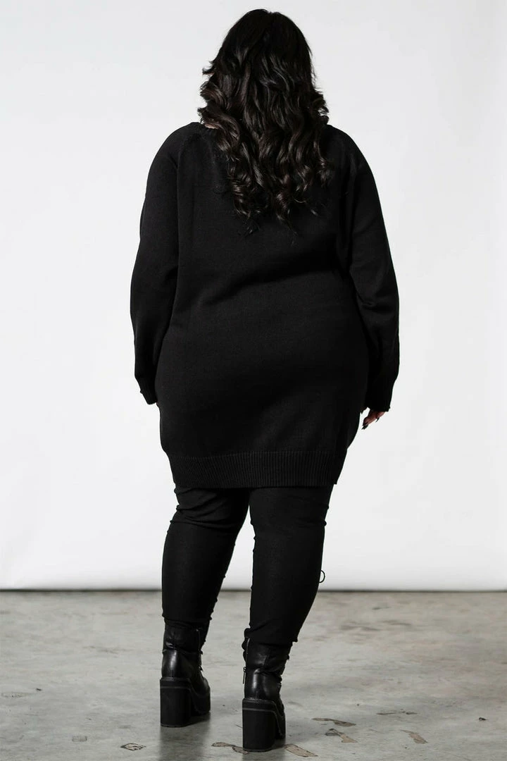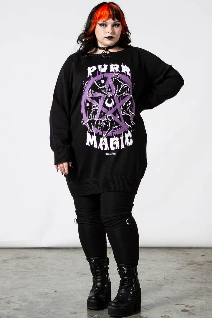 Must-have soft black pullover from Killstar. This comfy and soft longline jumper is made from soft fabric with a statement purple and white graphic print. Featuring a wide neckline and long sleeves, this versatile piece is long enough to be worn as a sweater dress or as the perfect layering piece.