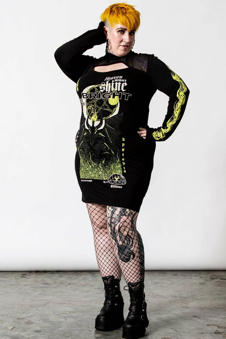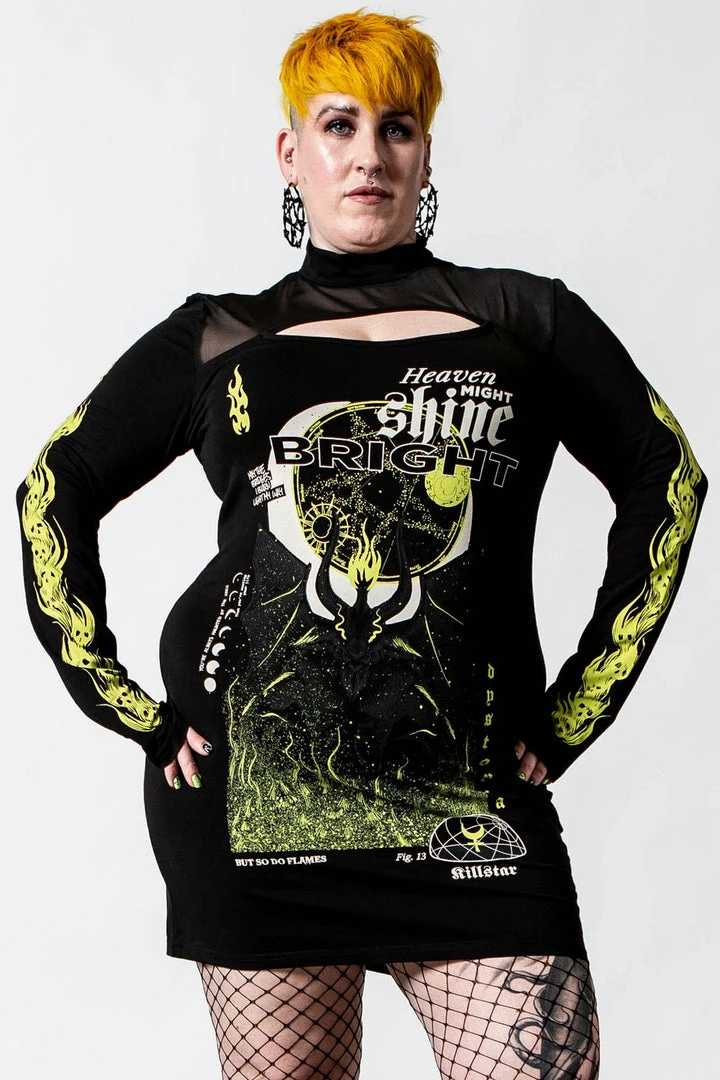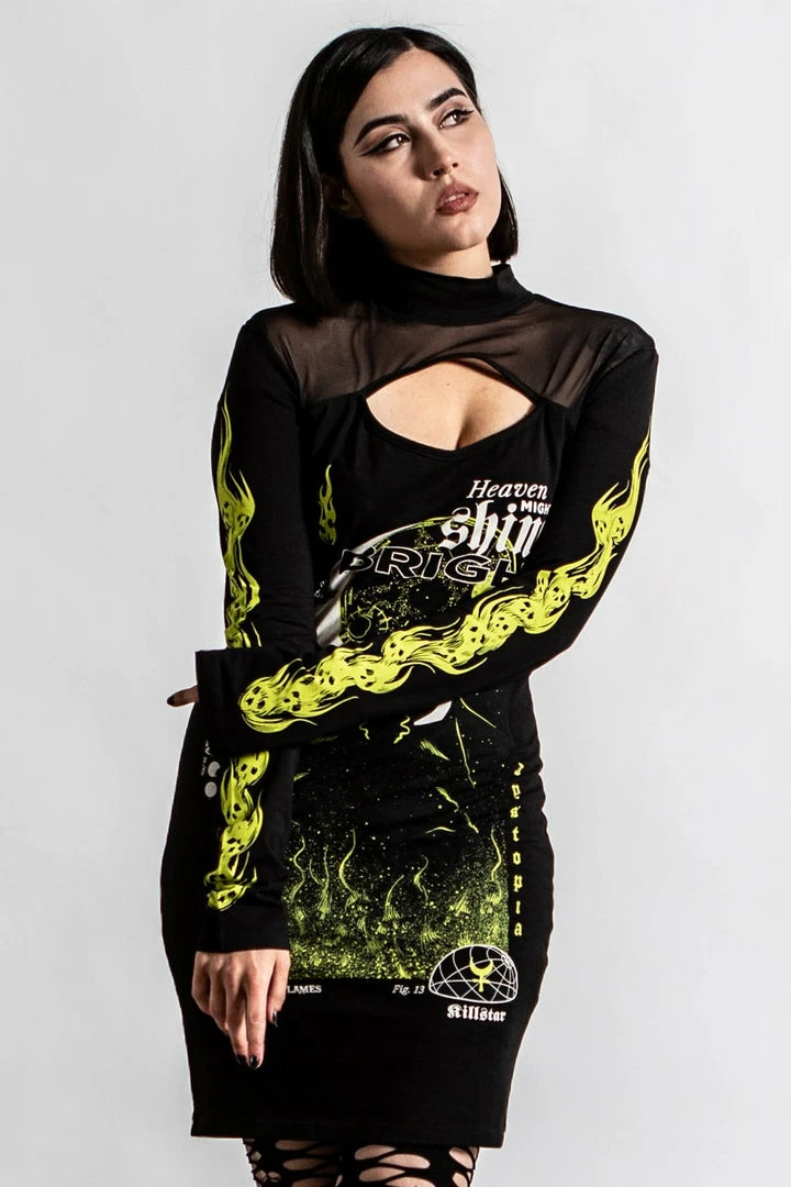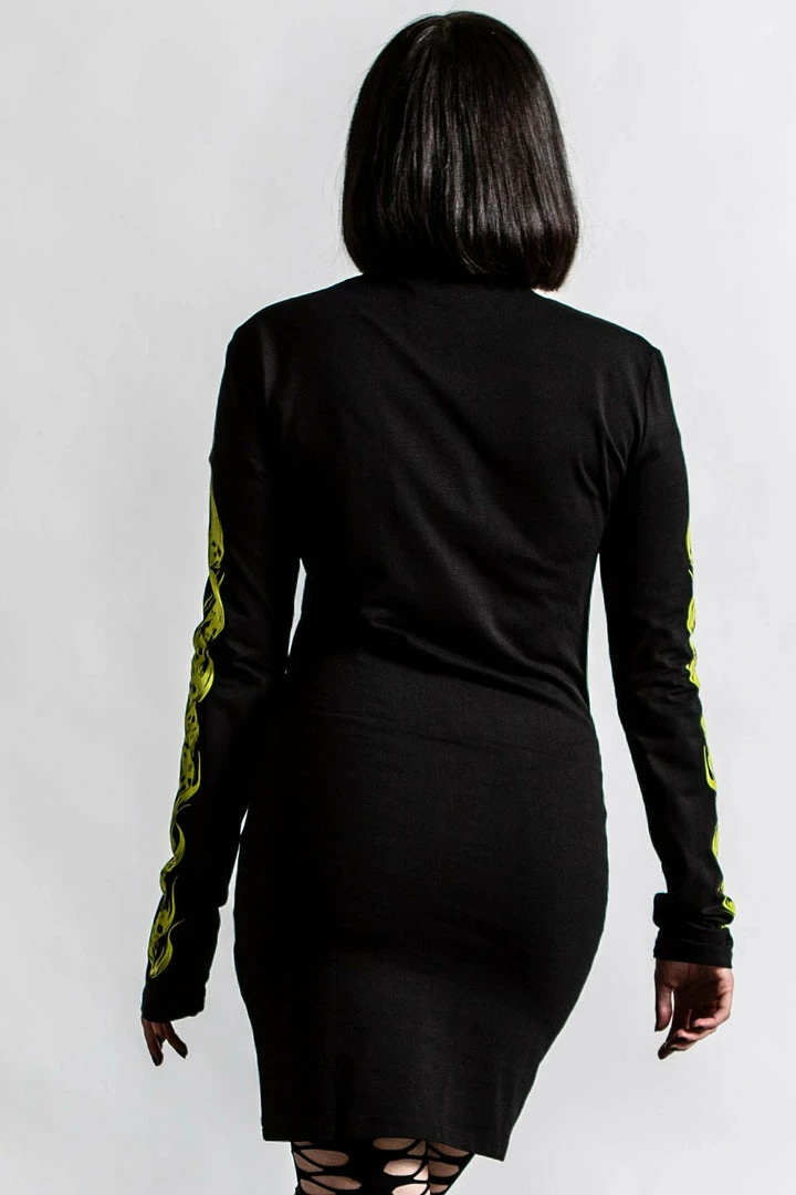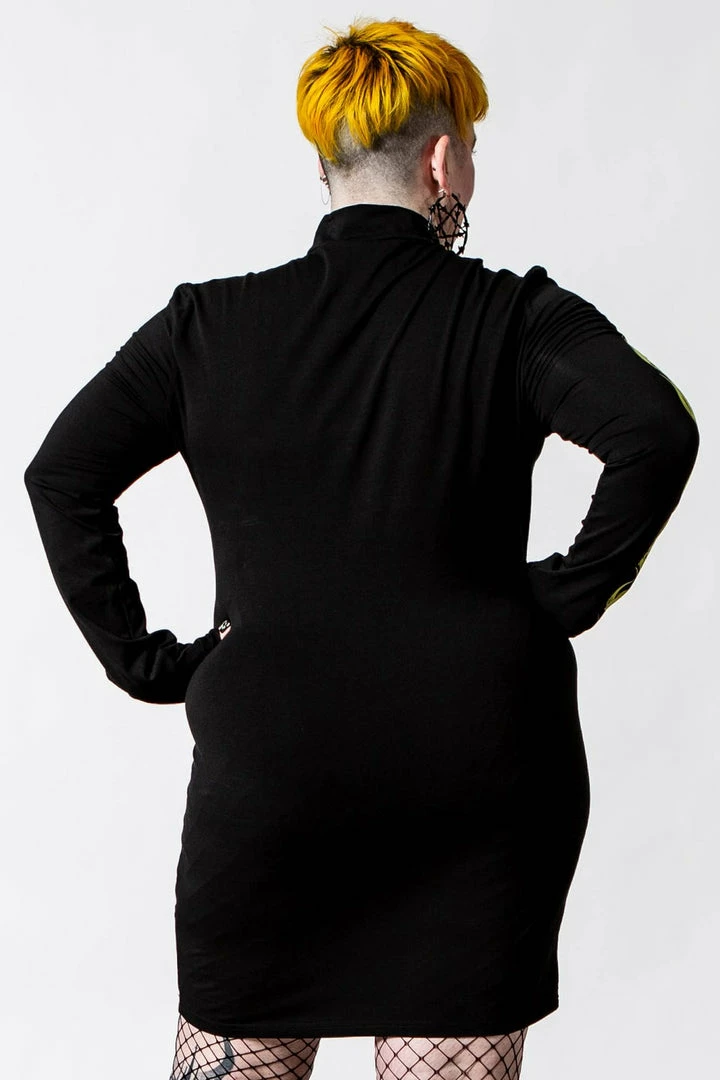 Striking long sleeved black mini dress with statement contrast print from Killstar. This stunning black dress is made from a soft stretchy cotton fabric that is fitted to accentuate your figure. Stylish and edgy, this fitted dress has a high neck with keyhole detail and mesh panel.