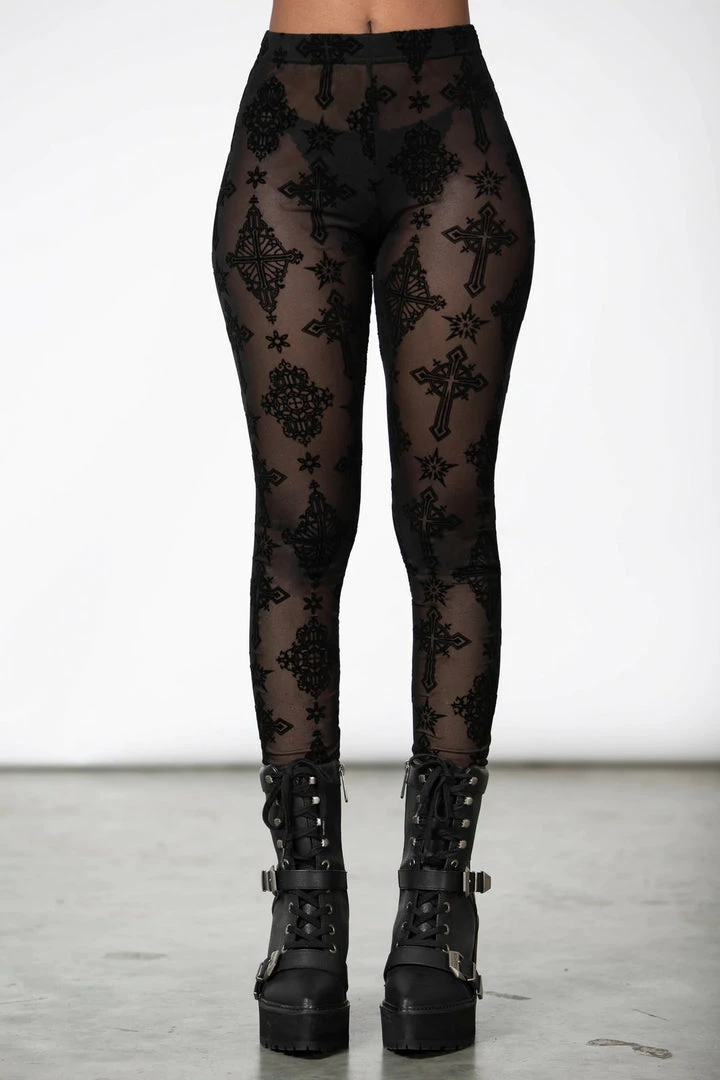 Irresistably stunning black mesh leggings from Killstar made from soft stretch sheer mesh fabric with an elasticated waistband. These seductive see-through leggings are fitted to flaunt your figure and have a statement flocked cross pattern that look amazing on a night out!