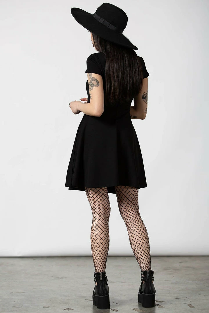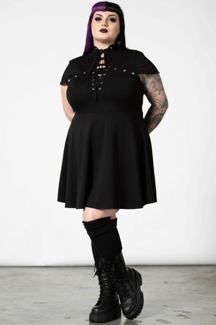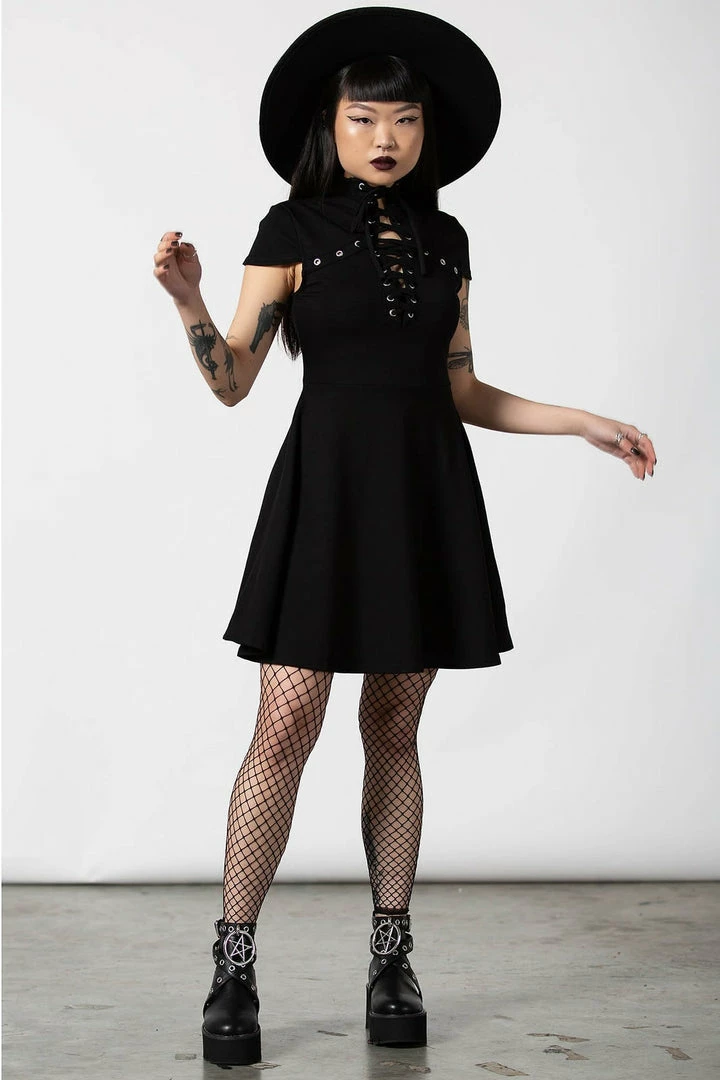 Must-have short black dress with flared skirt. This stunning dress by Killstar is made from a soft stretch fabric that is fitted to hug your figure. It also features short cap sleeves, a high neck with lace up detail and metal rivets. This dress looks amazing on!