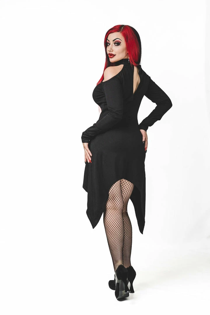 Stunning long sleeved dress from Necessary Evil featuring a high neckline with a cut-out décolletage and strap detail. With hook & eye fastening to the back of the neck, this flattering dress has an irregular hemline and the perfect amount of stretch.