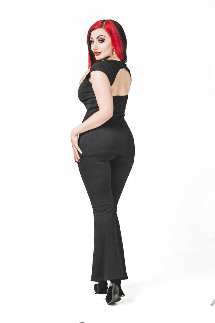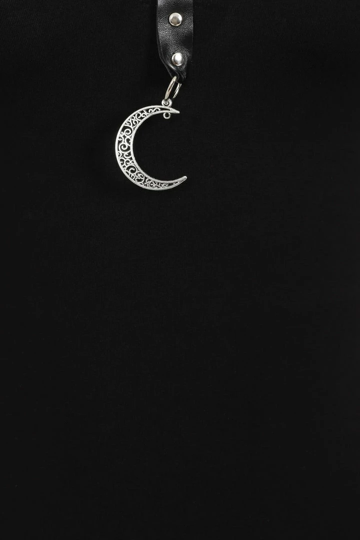 Lovely versatile top from Necessary Evil featuring a V-neck with short faux leather riveted strap with a filigree patterned crescent moon adornment and cap sleeves. Fastening at the back of the neck, this cute top has an eye-catching cut-out back and is perfect day or night.