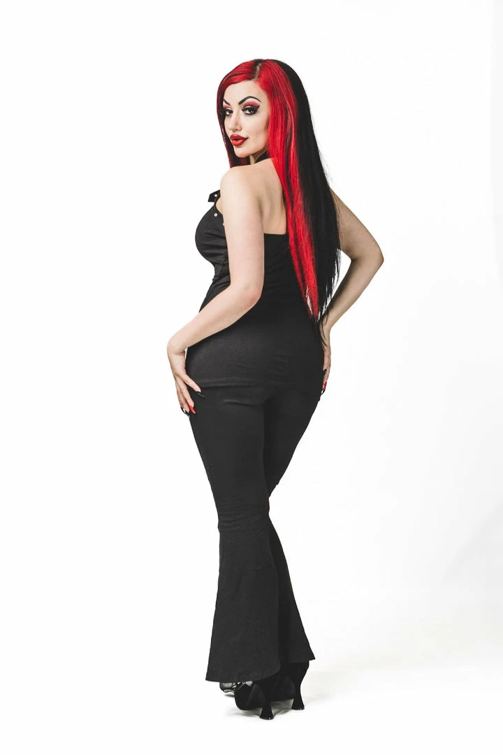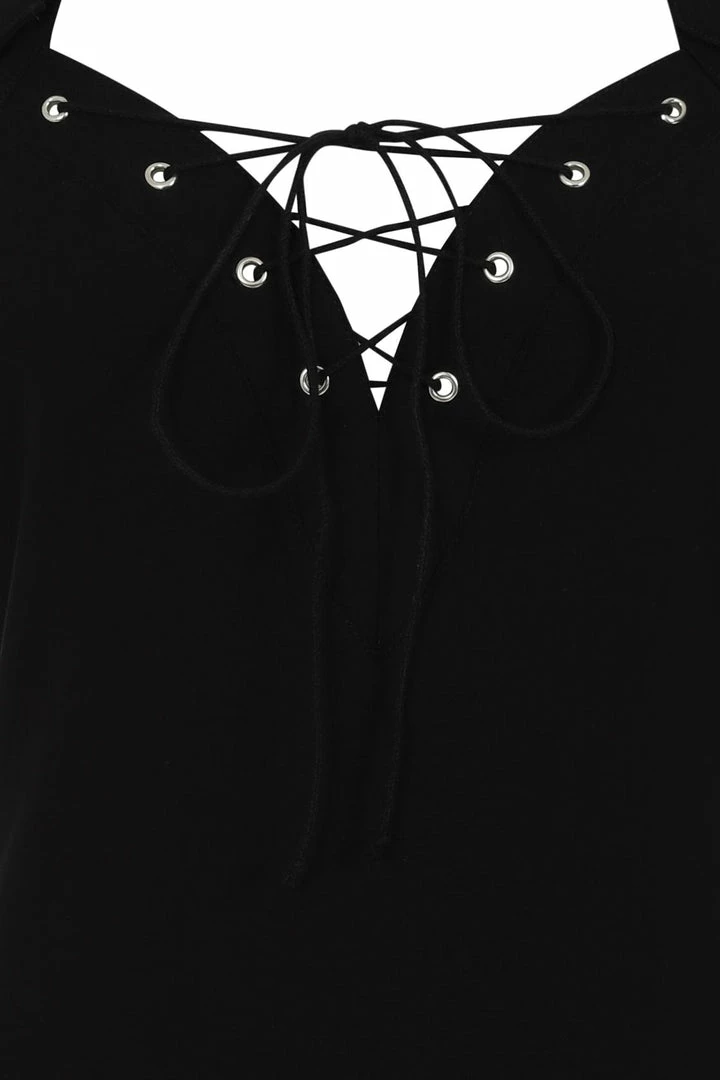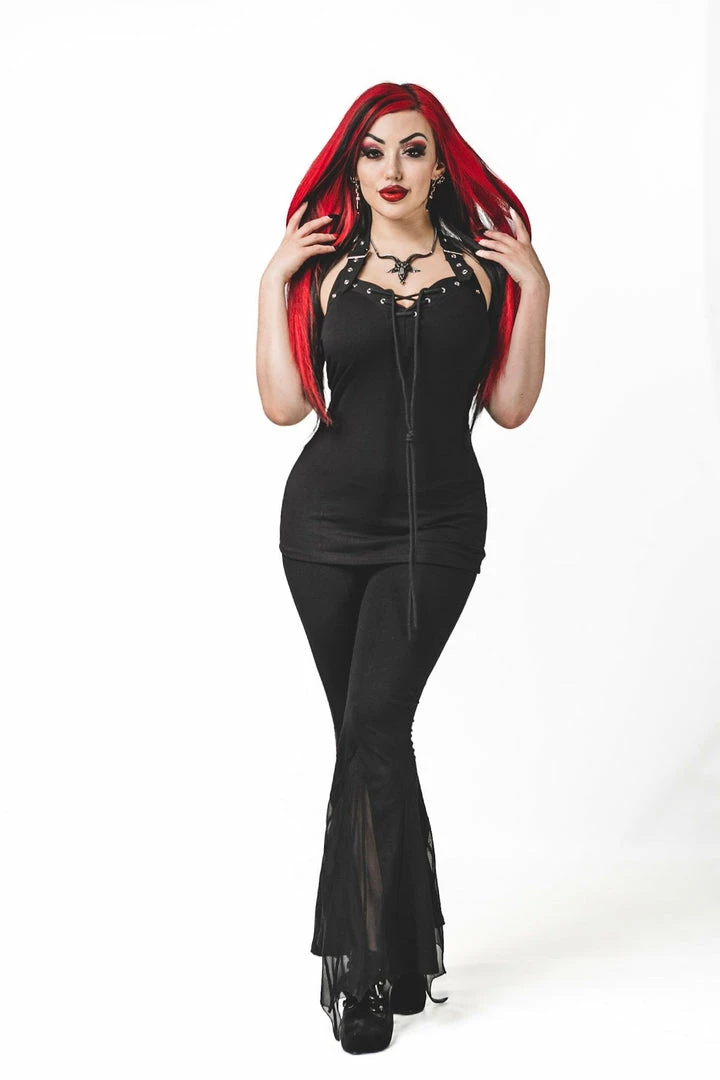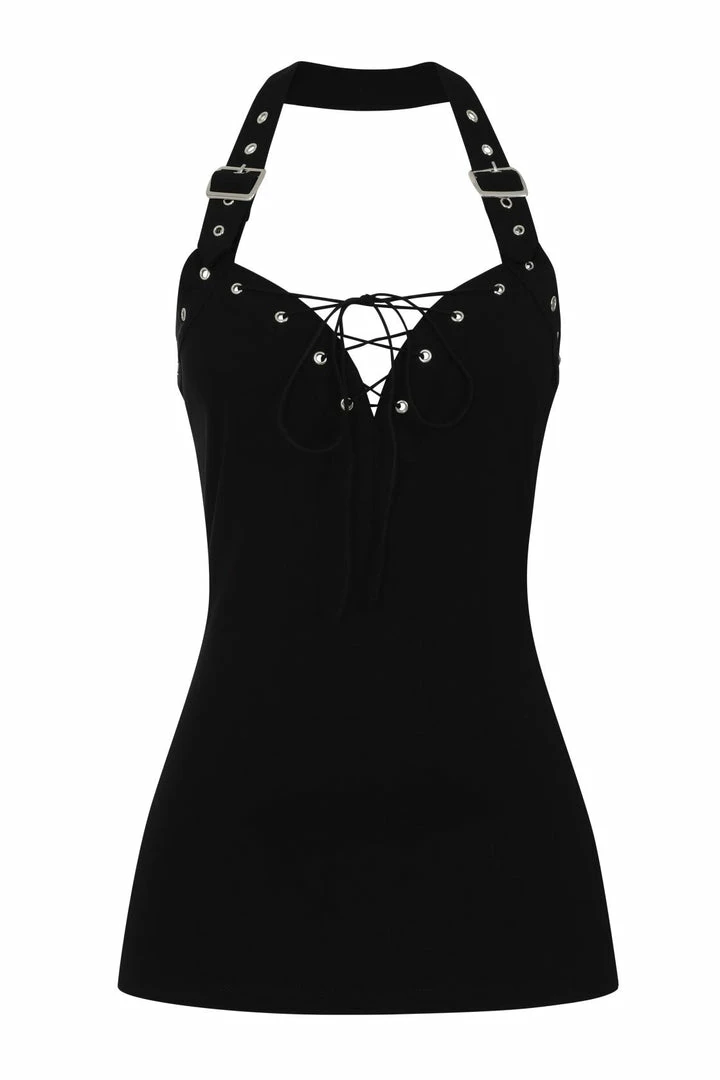 Necessary Evil Minerva Plunge Lace Up Black Top is a must have for your wardrobe! This stunning black gothic halterneck top features adjustable straps with buckle and eyelet detailing! The plunge neckline is eye catching with cord lacing and eyelets, perfect for a night out or dress it down for a striking day look!