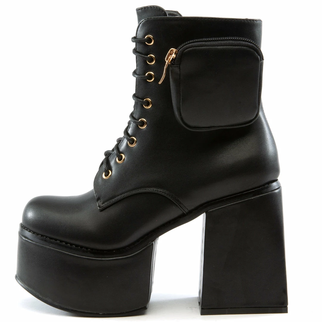 Cause a storm and turn heads in these envy inducing power boots from Ocho Toros! Black faux leather boots with a lace-up at the front and a zip up side pouch for useful storage. Elevate your look as these have an impressive 2.25 inch platform and 4.5 inch chunky block heel.