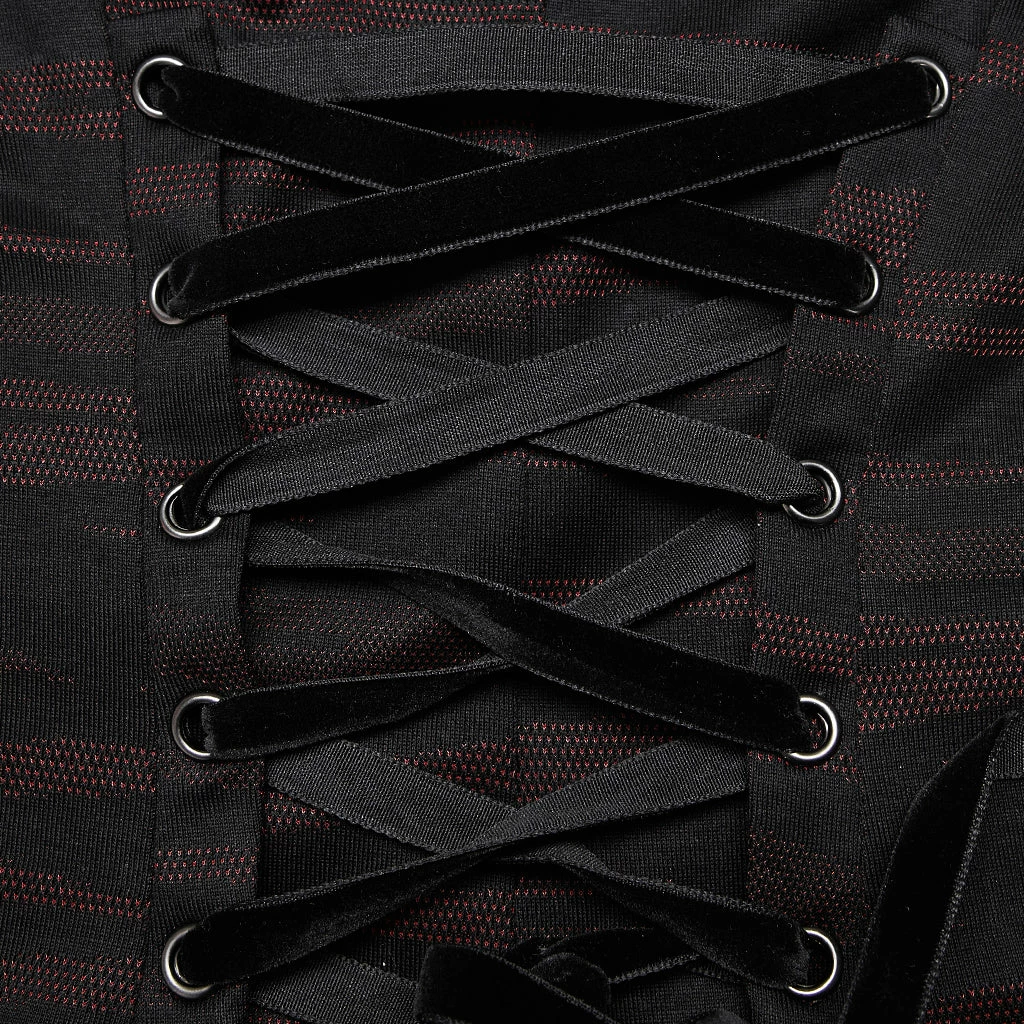 Stylish and seductive little black dress from Punk Rave! This LBD is made from a stretchy black and dark red striped fabric featuring splits and mesh panels and is fitted to show off those curves. This dress also has a bat neckline, detachable shoulder straps and lace up details. Looks stunning on!