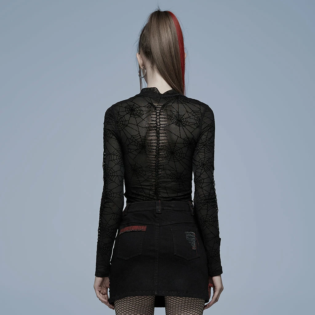 Stunning yet versatile black long sleeve top from Punk Rave with Gothic spiderweb mesh and textured fabric for a standout look! This lovely top is made from a super stretchy layered fabric that is fitted to cling to your curves. Looks fantastic dressed up or down!