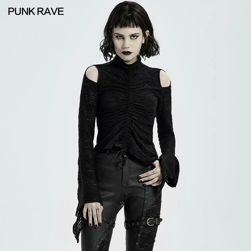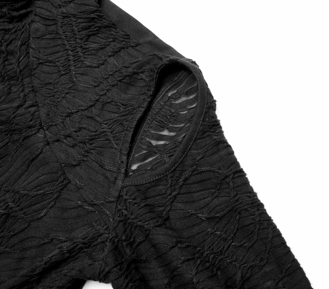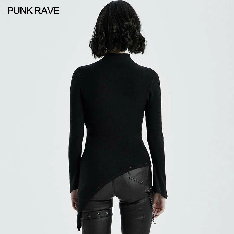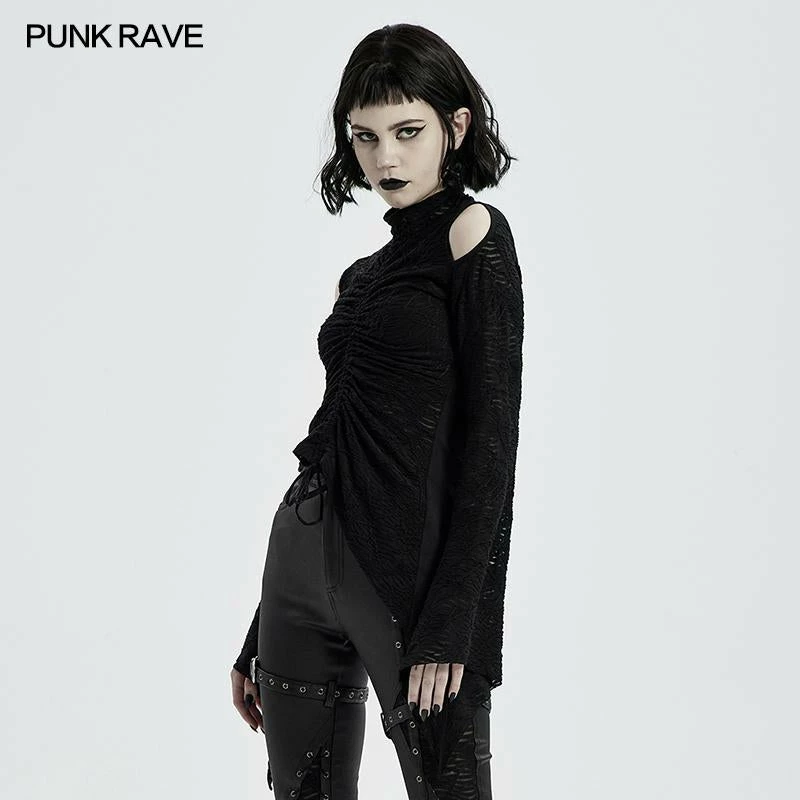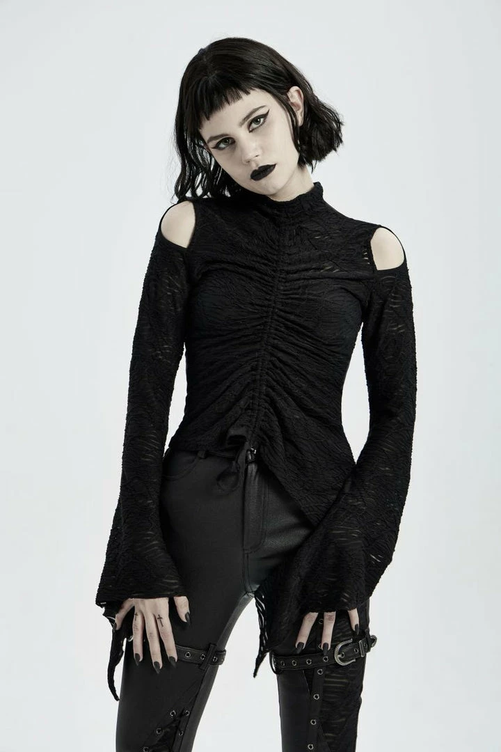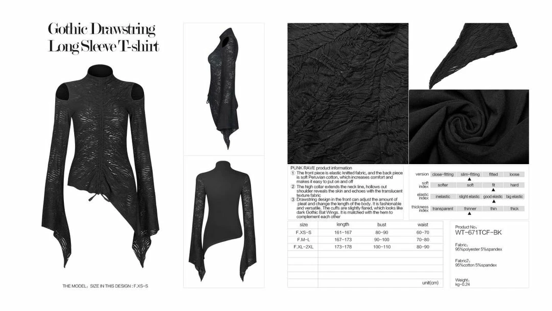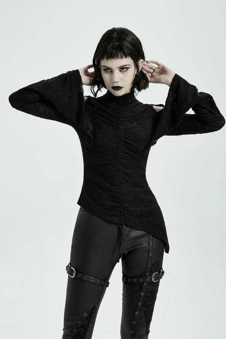 Stunning asymmetric top from Punk Rave featuring long sleeves with pointed flared cuffs, cold shoulder detail and a high neckline. With a lovely textured fabric to the front and sleeves, alter the look with the drawstring detail to the front. For the perfect fit please see Punk Rave’s size guide in the images.