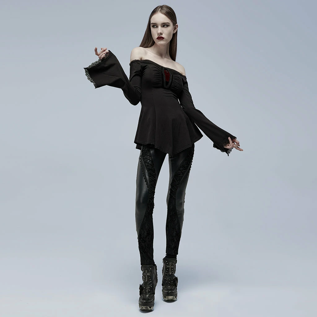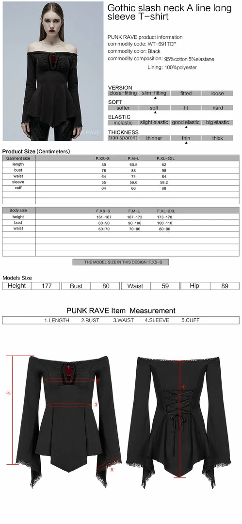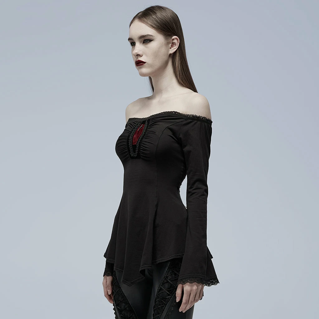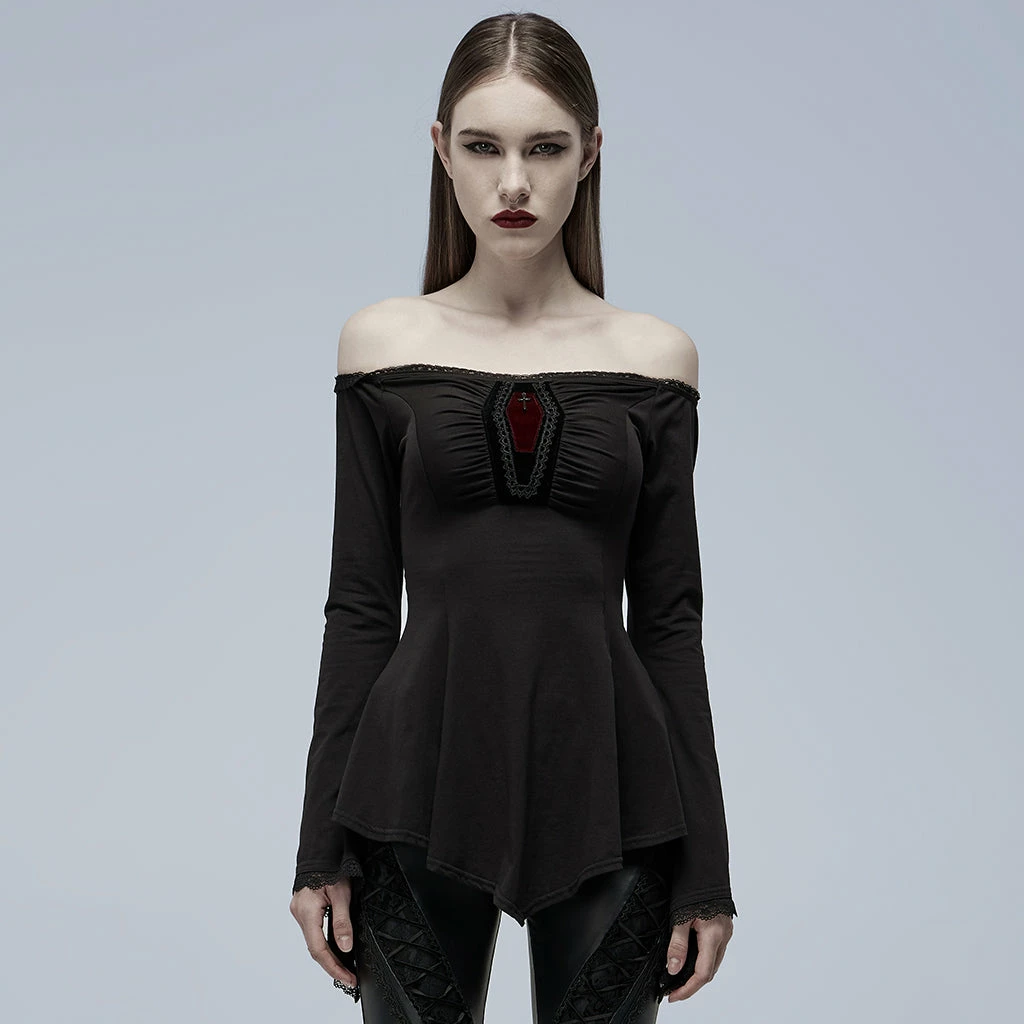 Classic Gothic slash neck A line long sleeve black blouse by Punk Rave. This exquisite long sleeve top is made from a soft stretch cotton blend fabric with a sexy slashed neckline. The A-line style highlights your curves and flatters your figure. This lovely top also features a red coffin design at the front and a lace up style back.