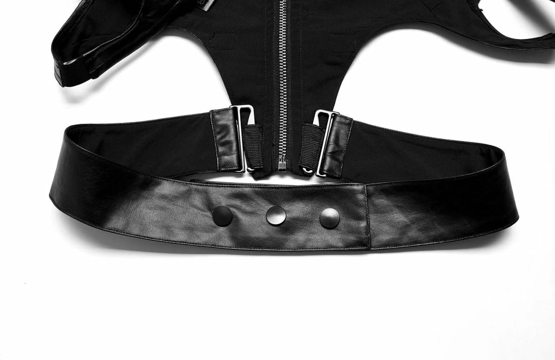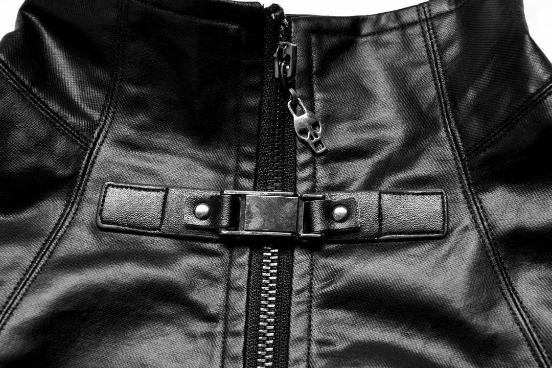 Striking leather look vest from Punk Rave featuring a high neckline and extra wide shoulders. Fastening with a bold zip to the front, this awesome top has a detachable waist strap, buckle details and a skull zip pull. For the perfect fit and fabric composition, please see Punk Rave’s size guide in the images.