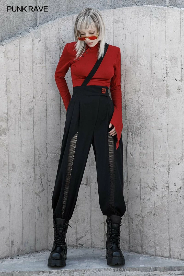 These lovely high waisted trousers from Punk Rave feature a geometric mesh panel to the front and a single detachable suspender strap. Fastening with a zip and stud fly, for the perfect fit please see Punk Rave’s size guide in the images.