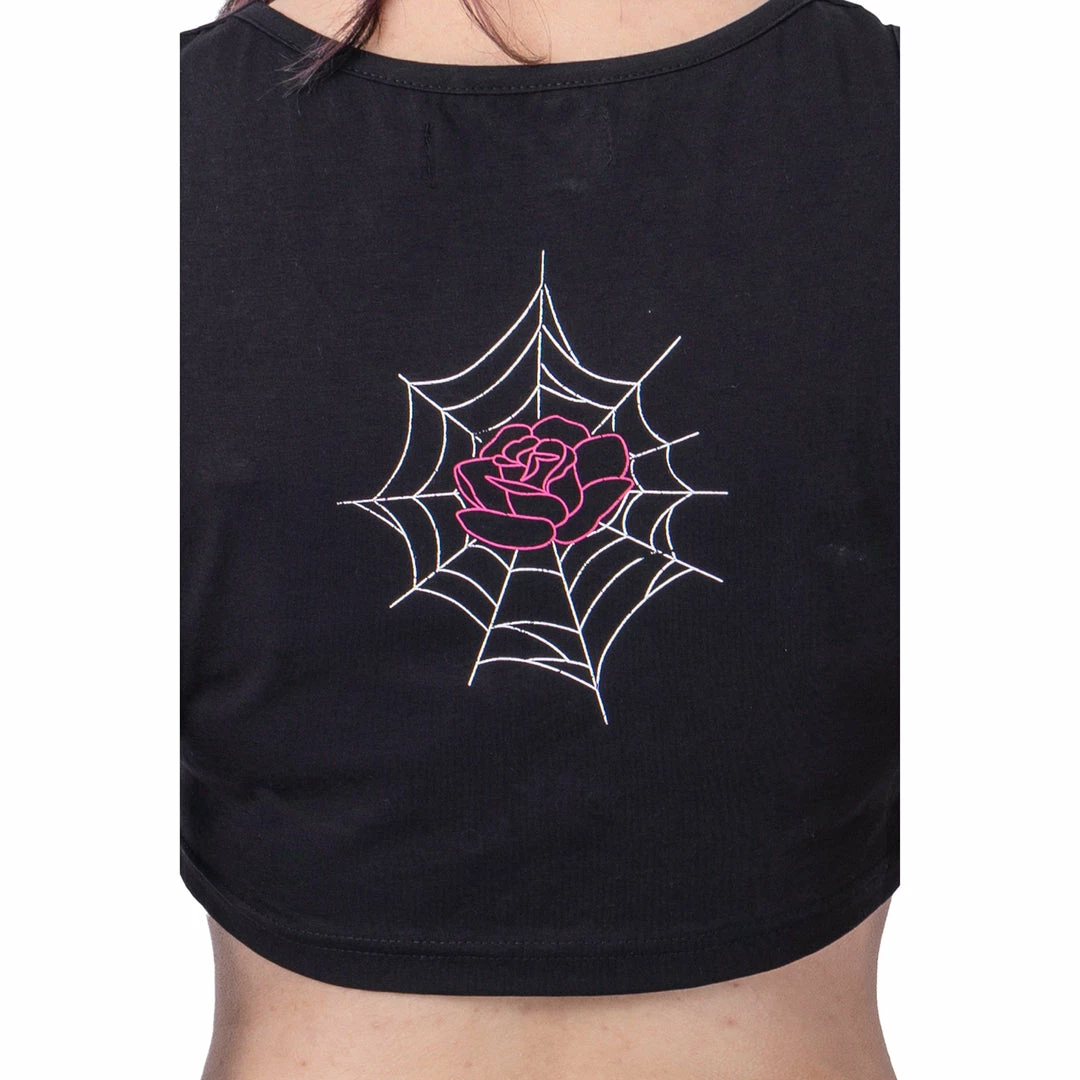 Amazing crop top from Rockabella featuring a contrasting white web print to the front and lace-up detail. With a web and rose print to the back, this versatile top looks great on.
