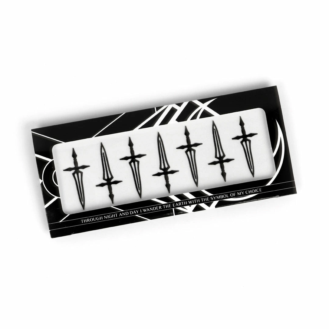 Magic Markings Black Dagger Face Art adhesive stickers with an intricate dagger motif. Add a sharp edge to your look with these dagger design face art stickers!