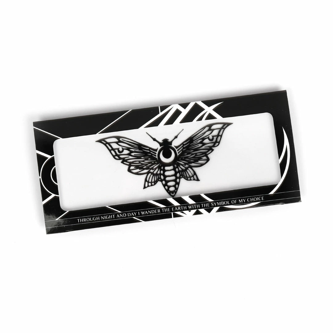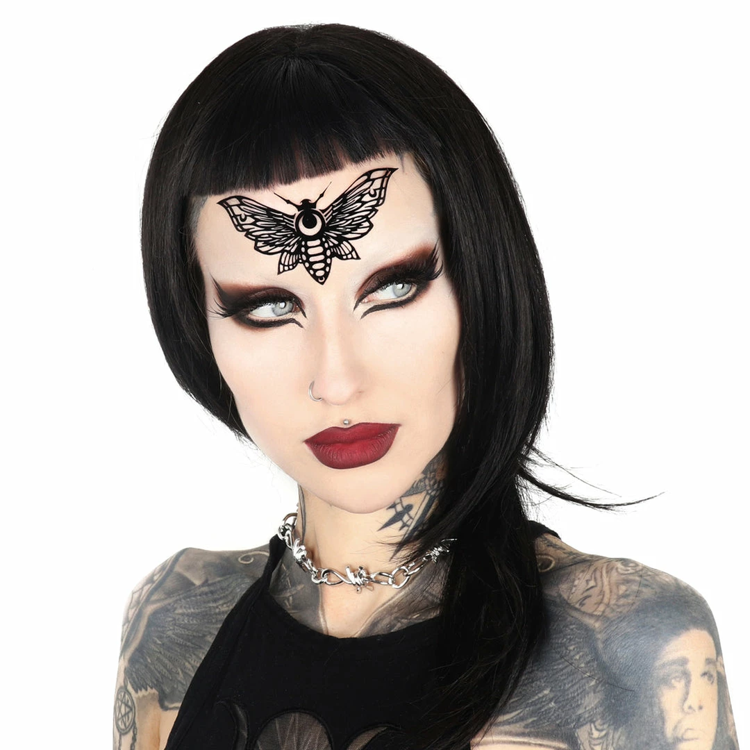Magic Markings Black Lunar Moth Face Art adhesive sticker. Transform your make up and look into an entrancing artistic statement with this intricate design.